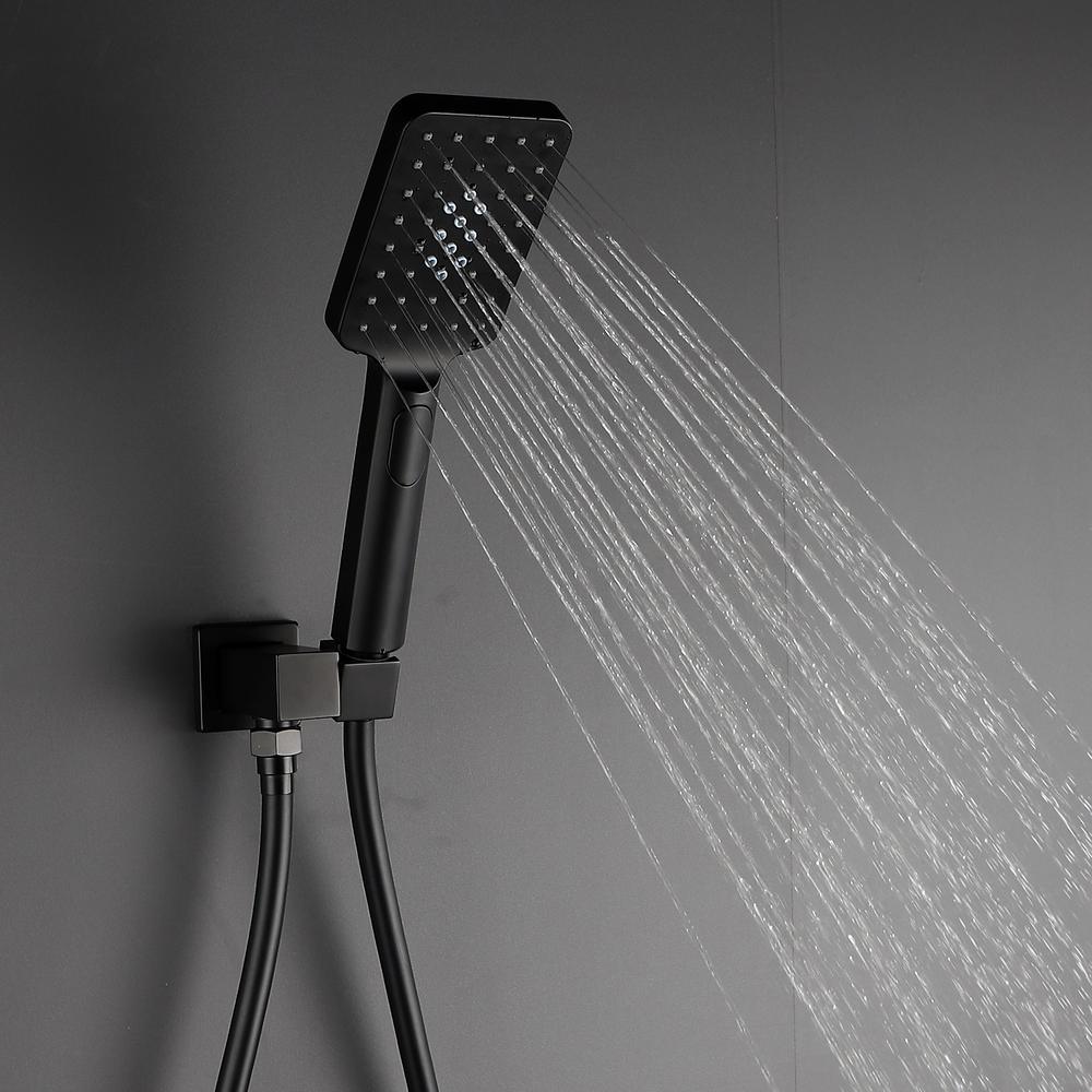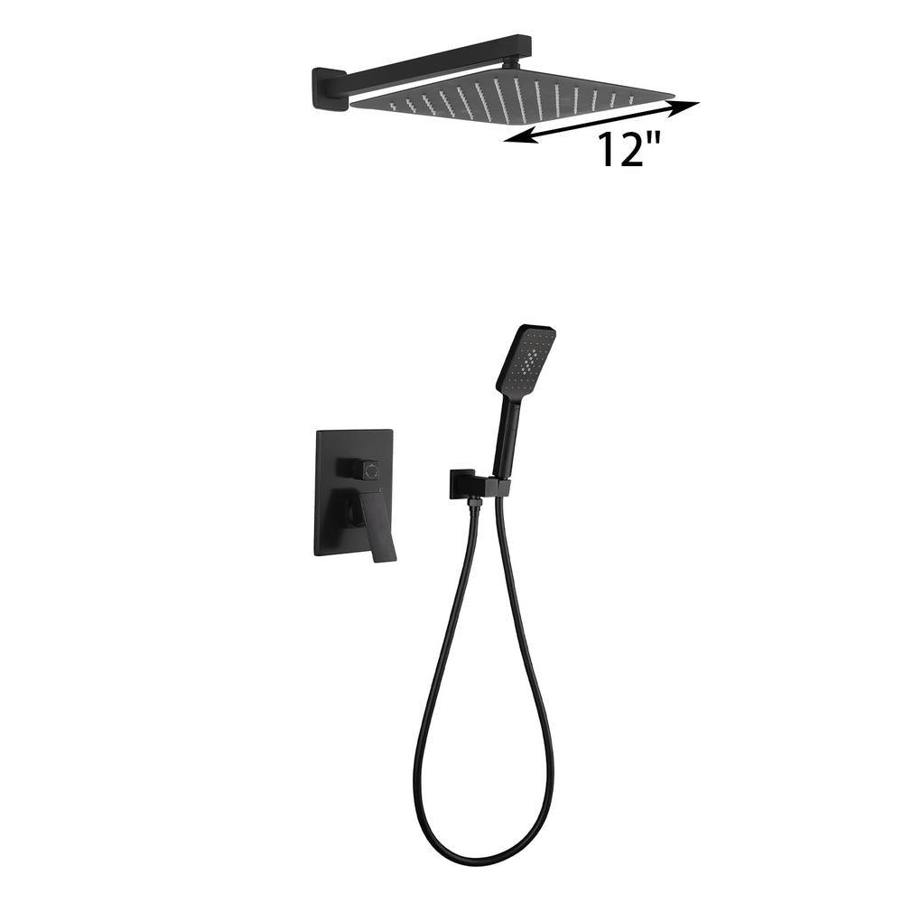 • Complete Modern Shower System with Valve -- The shower faucets set complete includes 12-inch square shower head, handheld shower, 15-inch shower arm, shower holder, pre-embedded rough-in valve, and 60-inch shower hose. The matte black finish and brass combination offers anti- corrosion and classical looking. All parts of the waterfall shower set are made of heavy metals with professional technology. The modern shower system makes you feel refreshed and invigorated.