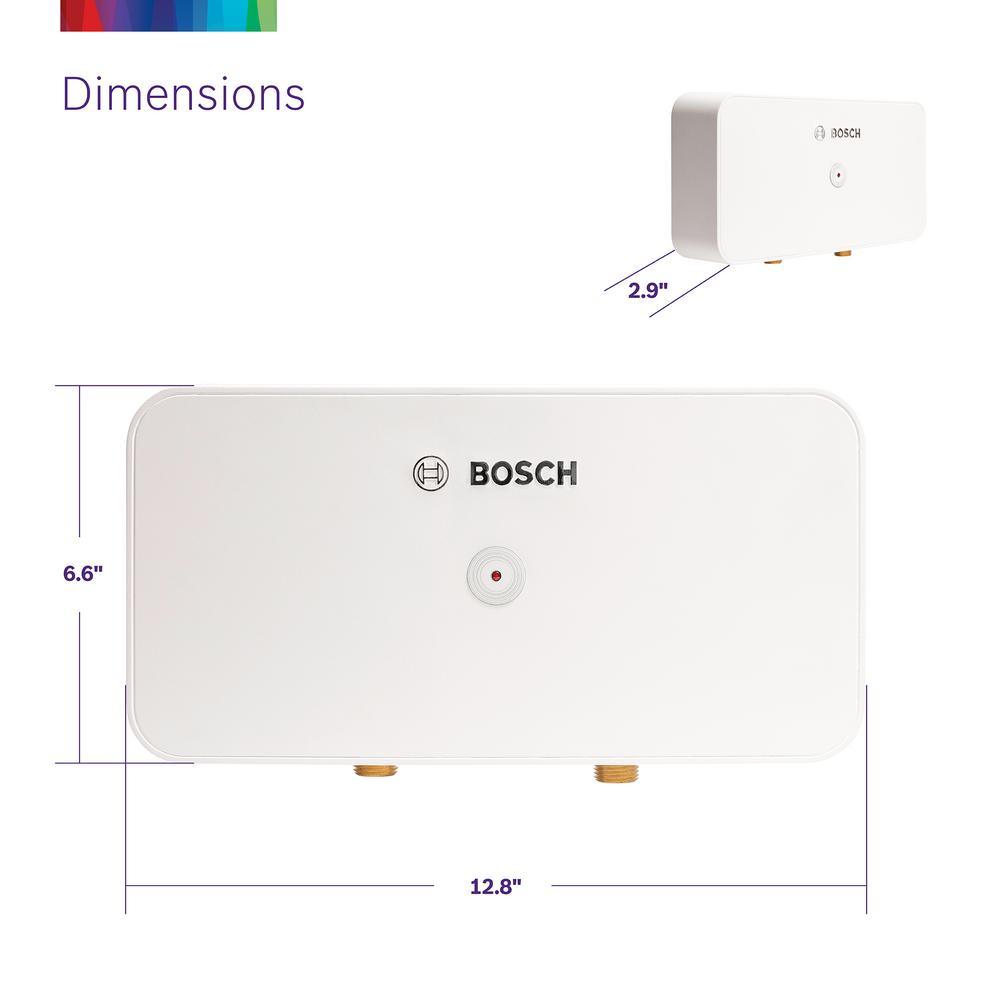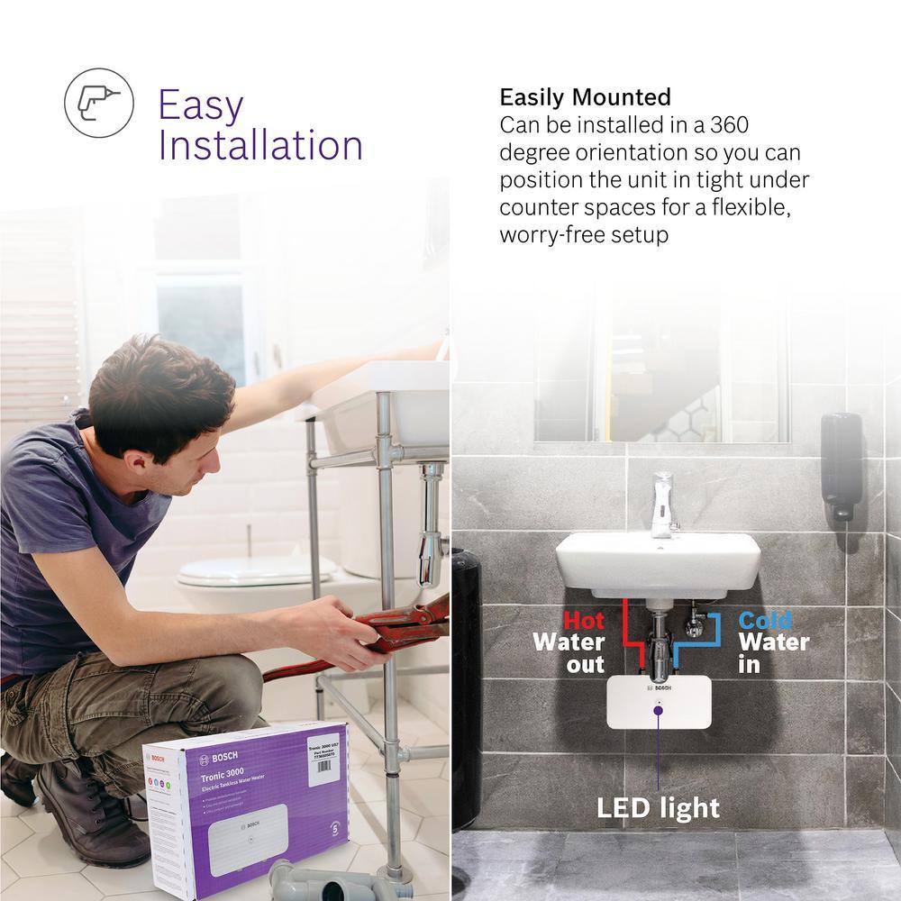 The Bosch 3.4 kW tankless water heater is a point-of-use water heater that helps eliminate long waits for hot water. Ideal for isolated sink locations in a home, office, warehouse or service station. A copper heat exchanger, 98% efficiency and the ability to heat only the water you use mean that you save water, energy and money. Units are compact with flexible installation configurations.