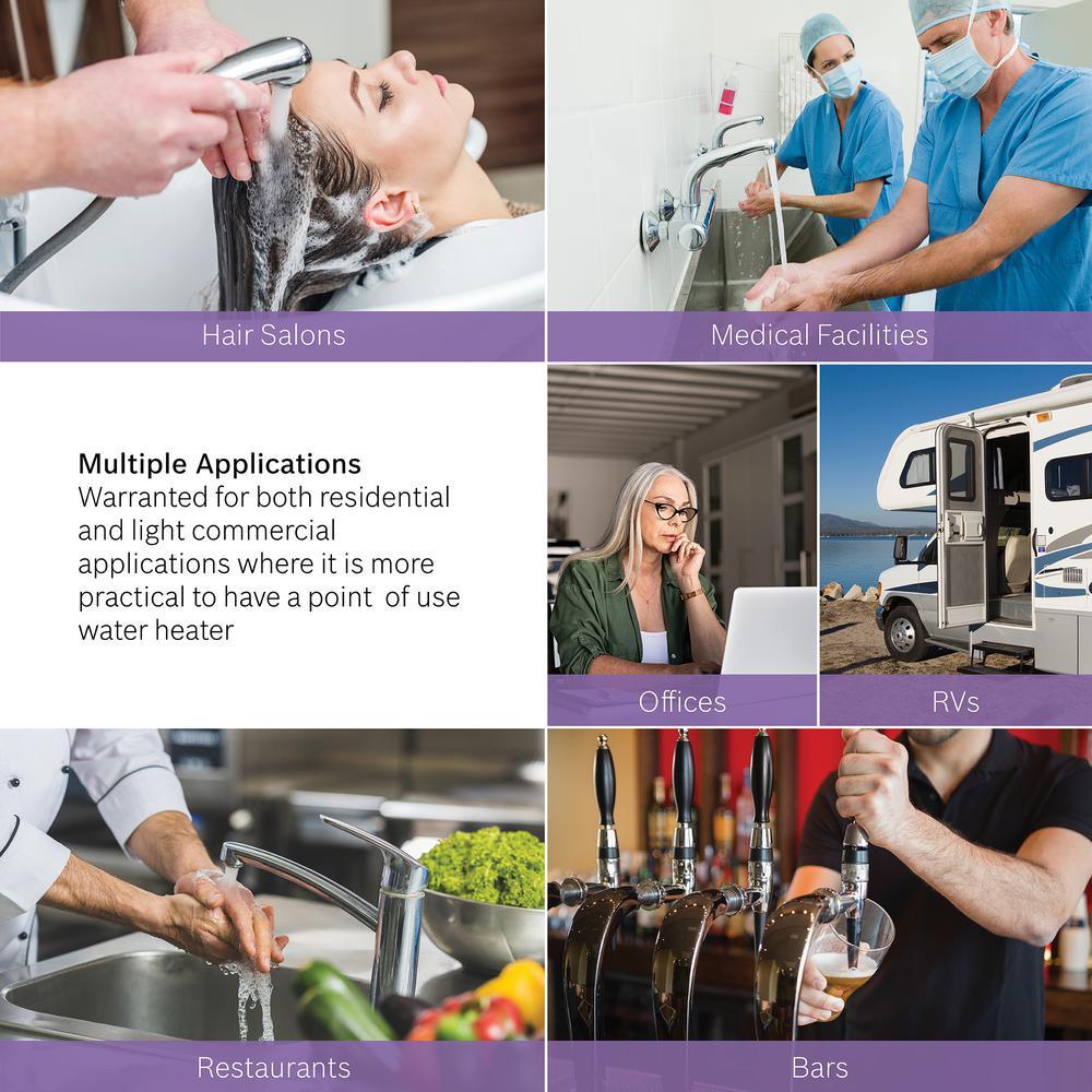 The Bosch 9 kW tankless water heater is a point-of-use water heater that helps eliminate long waits for hot water. Ideal for isolated sink locations in a home, office, warehouse or service station. A copper heat exchanger, 98% efficiency and the ability to heat only the water you use mean that you save water, energy and money. Units are compact and can be installed in any direction for flexible installation configurations.