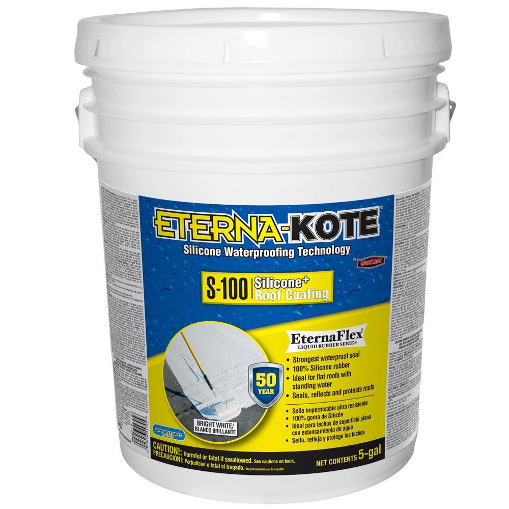Eterna-Kote S-100 Silicone Roof Coating is a 100% white silicone coating that provides the ultimate durability and longevity to your roof surface. This product has the highest degree of waterproofing protection and provides superior protection to the underlying roof surfaces. It is ideally suited for flat roofs that have a tendency to pond water, as well as on installations that require the best waterproofing coating available. The bright white finish keeps roofs cool, which in turn can help lower cooling costs. In hot or cold climates, this coating forms a seamless layer of waterproofing coating that will stretch to prevent cracking and peeling. This is our best liquid waterproofing coating.
