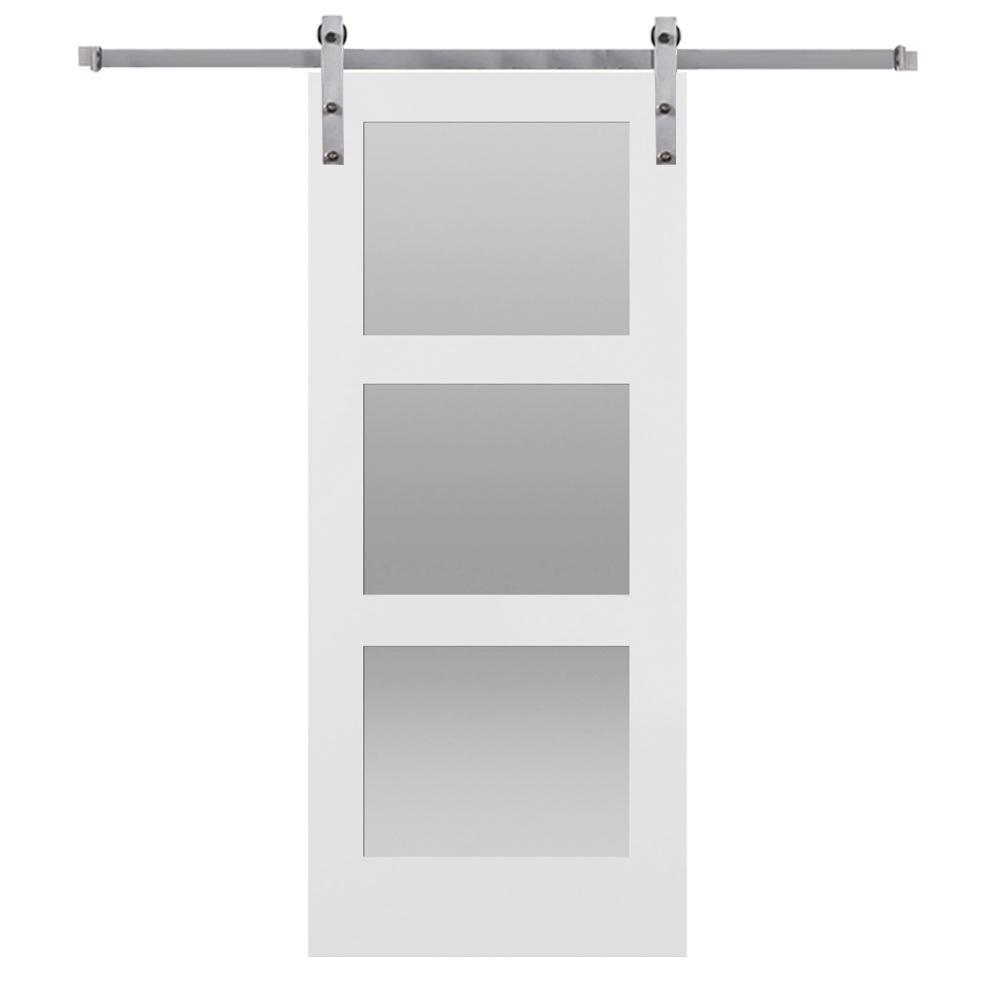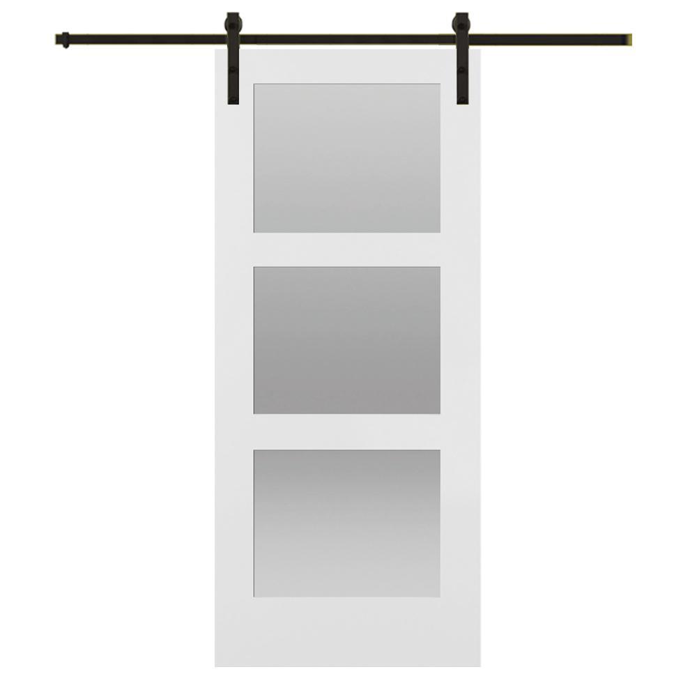 MMI DOOR primed shaker 3-lite privacy glass barn doors are manufactured to eliminate warp, panel shifting and glass rattling. The frosted glass panes offer superior privacy while still allowing light into your room. Each door is paired with our classic bent strap roller hardware kit in matte black finish. Combining both modern style and practicality, our shaker privacy glass barn doors offer a fresh and unique take on a traditional and timeless look. Ideal for openings up to 38 in. wide and up to 82 in. H.
