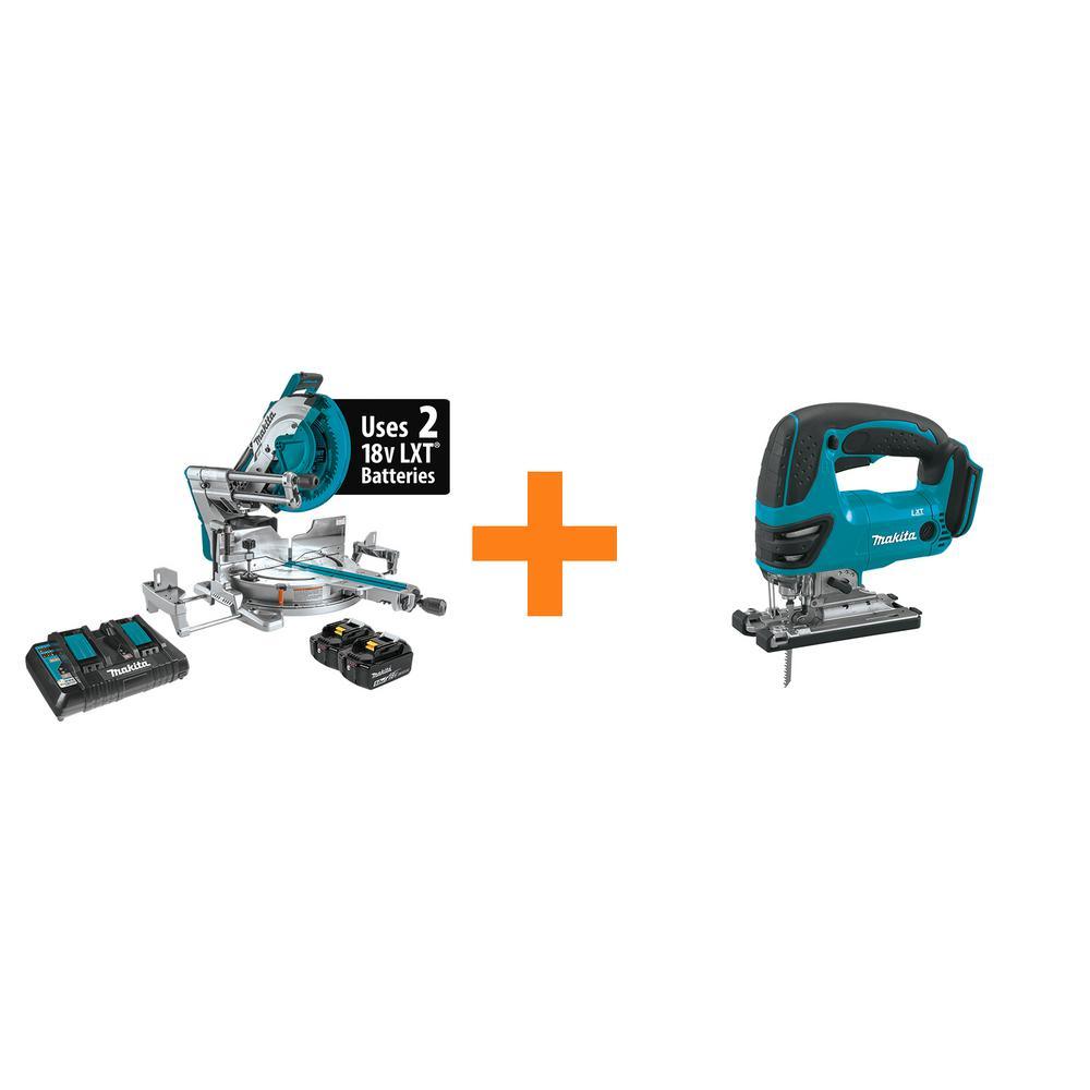 Makita is a pioneer in brushless motor engineering, battery technology, and miter saw innovation. This combined expertise resulted in the 18-Volt X2 LXT (36-Volt) Lithium-Ion Brushless 12 in. Dual Bevel Sliding Compound Miter Saw Kit (XSL08PT), AWS and Laser. It's powered by two 18-Volt Lithium-Ion batteries for 36-Volt power and performance, but without leaving the 18-Volt LXT platform. X2 LXT technology delivers increased power, speed, and run time, without the hassles of a cord. Get up to 175 cuts per charge in 2 in. x 12 in. SPF lumber with two 5.0 Ah batteries. The efficient BL Brushless Motor runs cooler and more efficiently for longer tool life and delivers up to 4,400 RPM for fast and smoother cutting. The XSL08PT also features Automatic Speed Change technology to adjust cutting speed and torque under load for optimum performance. For improved efficiency, its equipped with Auto-Start Wireless System technology. AWS utilizes Bluetooth technology for wireless communication between the tool and dust extractor (sold separately). When the trigger of the AWS-equipped XSL08PT is engaged, the AWS-equipped dust extractor powers-up. This Promotion also comes with a bonus XVJ03Z 18V LXT Lithium-Ion Cordless Jig Saw, Tool Only.