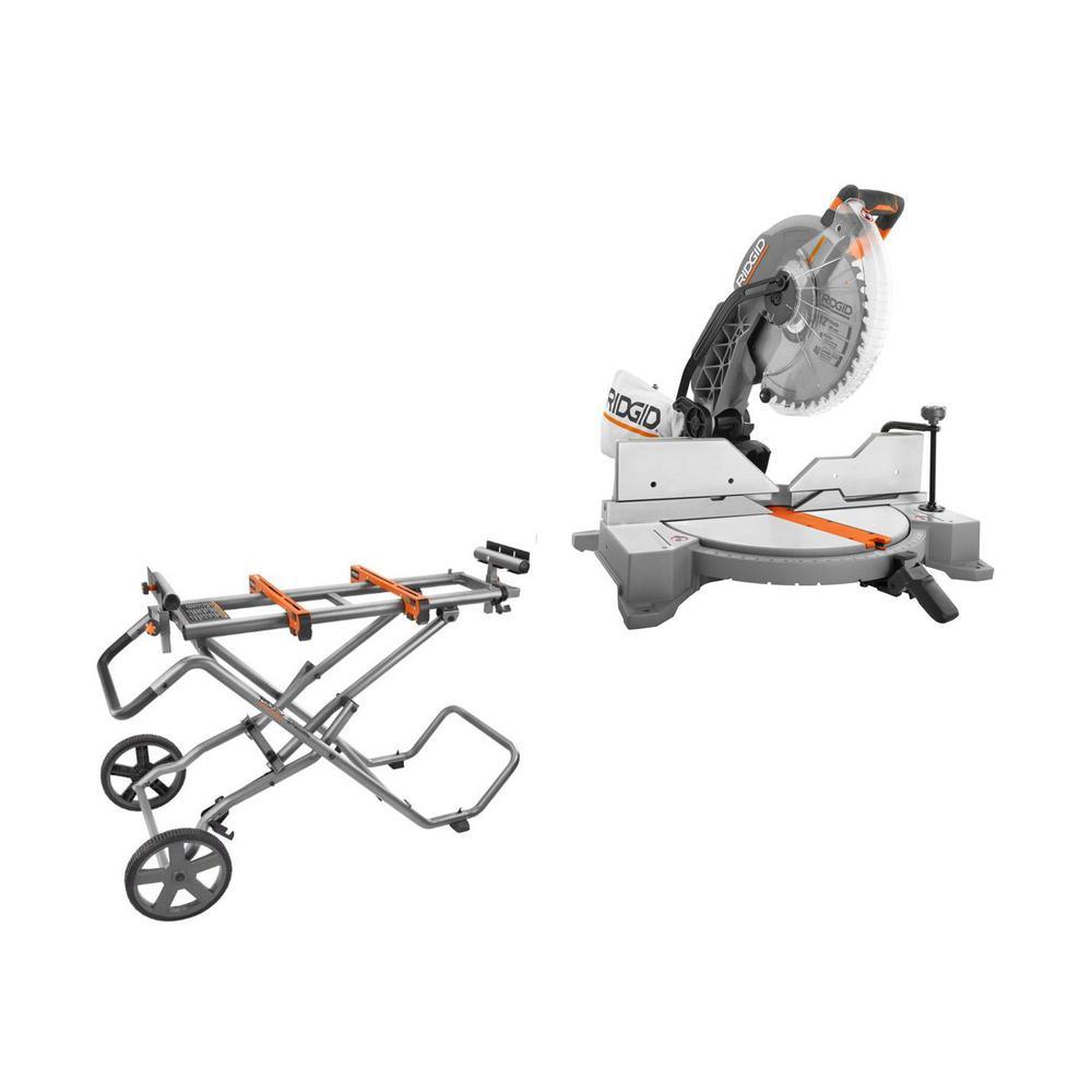 RIDGID introduces the 15 Amp Corded 12 in. Dual Bevel Miter Saw with LED with Universal Mobile Miter Saw Stand with Mounting Braces. The saw has a dual bevel capability and adjustable miter table make it perfect for a wide range of cuts and applications. A powerful motor paired with best-in-class features provides ultimate convenience on any job site. The stand is compatible with most common miter saws and the utility vehicle sets up in seconds. The stand features an upright folding design for easy storage, set-up and break down. Backed by the Industry Leading Lifetime Service Agreement, this kit includes a 15 Amp 12 in. Dual Bevel Miter Saw with LED with a 12 in. blade and blade wrench, sliding miter fences, a dust bag, a work clamp, a Mobile Miter Saw Stand and Utility Vehicle with 2 mounting brackets, 2 material stops, 2 material supports, hardware, 2 wheels, a handle, 2 feet, a frame support leg, and operator's manuals.