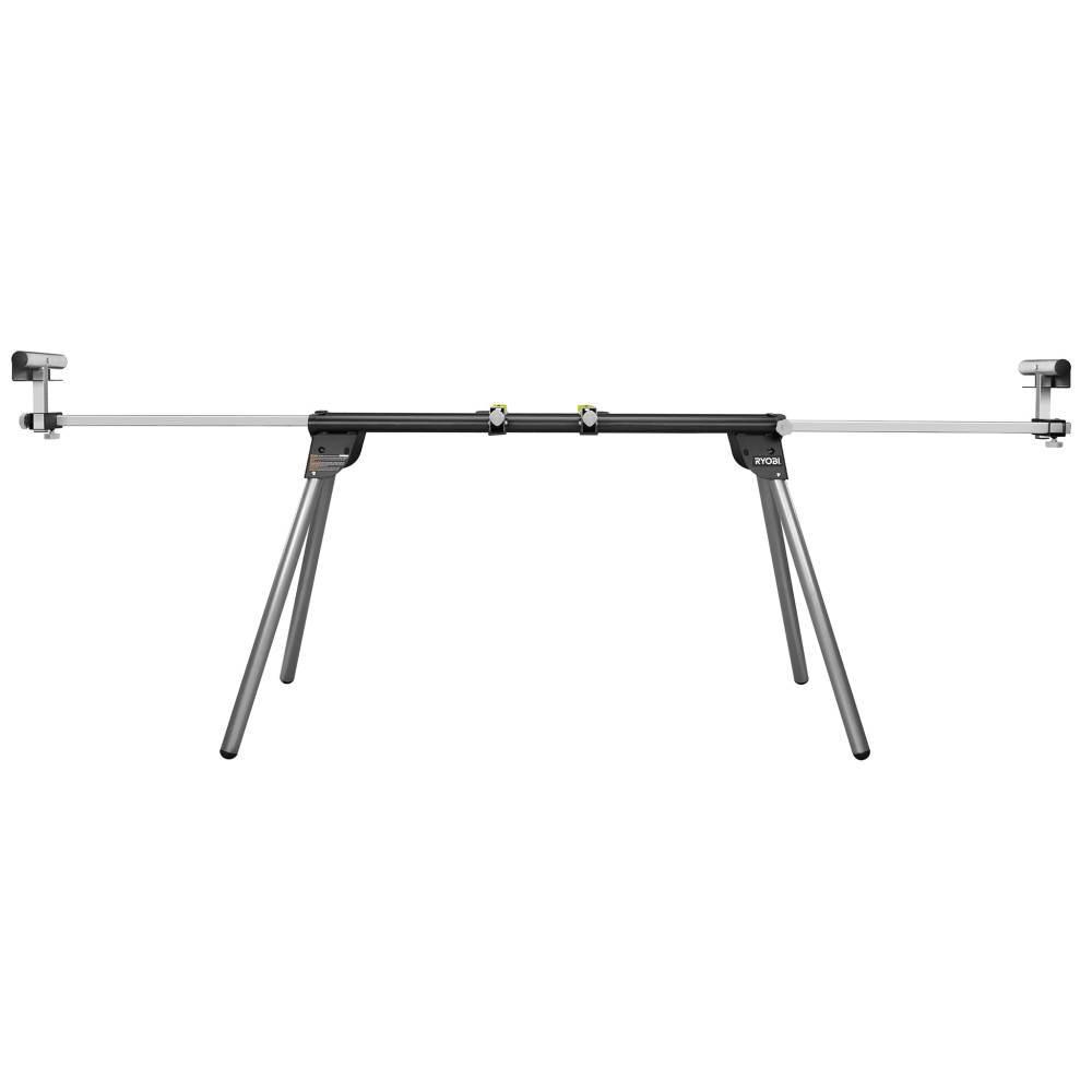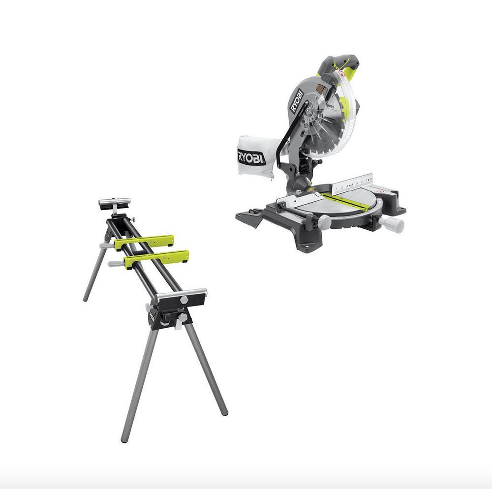 RYOBI introduces the 10 in. Compound Miter Saw with LED with Stand. he heavy duty 14 Amp motor delivers up to 5,500 RPM for the power to make difficult cuts. It features a 1-1/4 in. dust port to help keep your work area clean. The 24-tooth Carbide-Tipped blade provides improved performance for fast, clean cuts and an LED Cutline Indicator for higher accuracy. The RYOBI Miter Saw Stand is ideal for any miter saw user. It features durable construction that can fit most miter saws and folds up for easy storage and portability while it supports your saw with a rugged steel frame to accommodate any project at home or on the job. Backed by the RYOBI 3-Year Manufacturer's Warranty, this kit includes a 10 in. Compound Miter Saw with LED with a 24-tooth Carbide Tipped Blade, a blade wrench, a dust bag, a work clamp, a Miter Saw Stand with hardware, saw brackets, material supports, material stops, and an operator's manual.