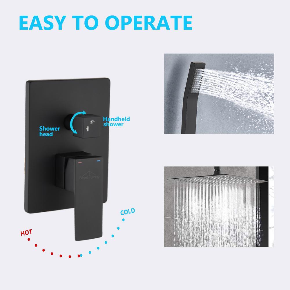 12-inch 304 stainless steel big top spray, 1.5-meter long hand shower hose and 8 inch copper hand shower, bring to the users with a more comfortable bathing experience.