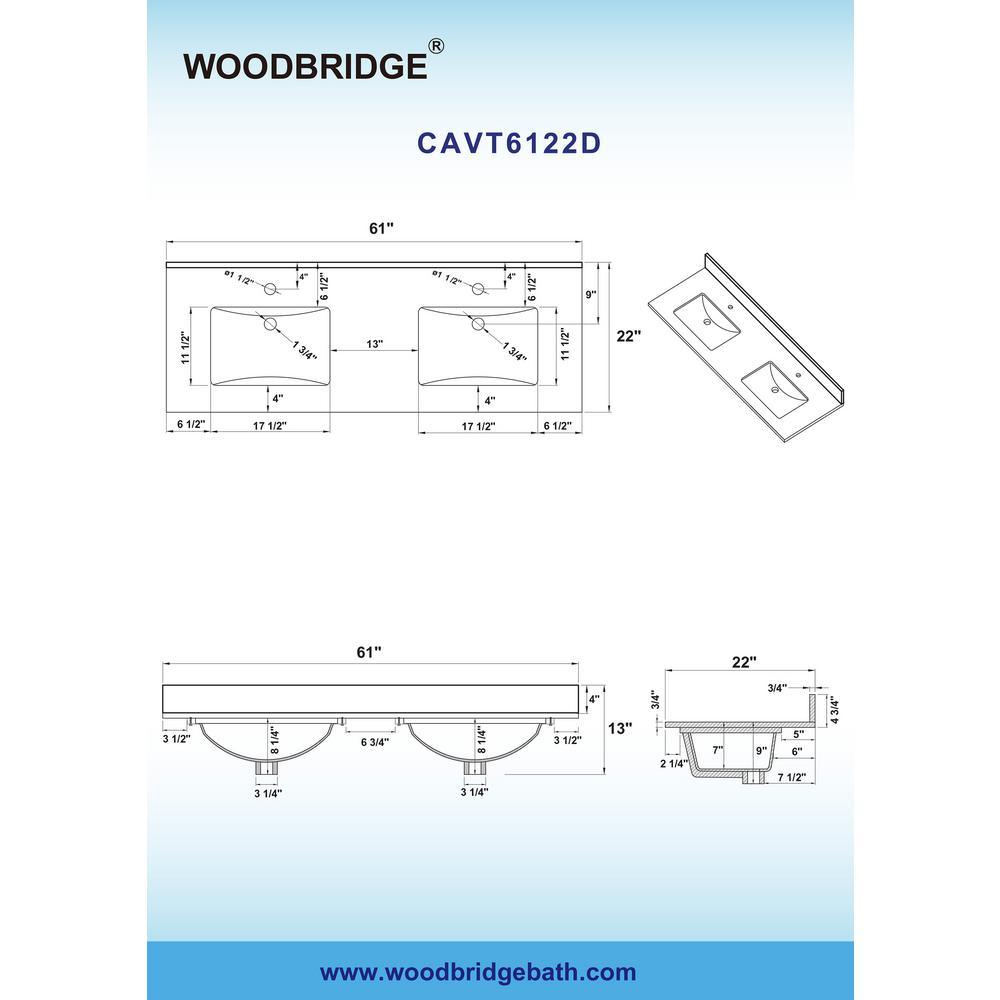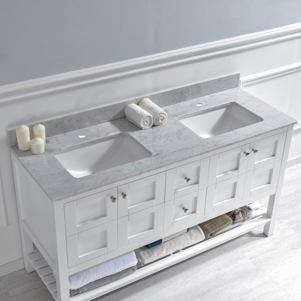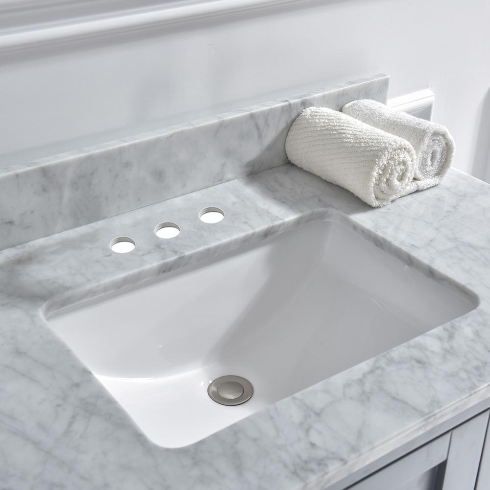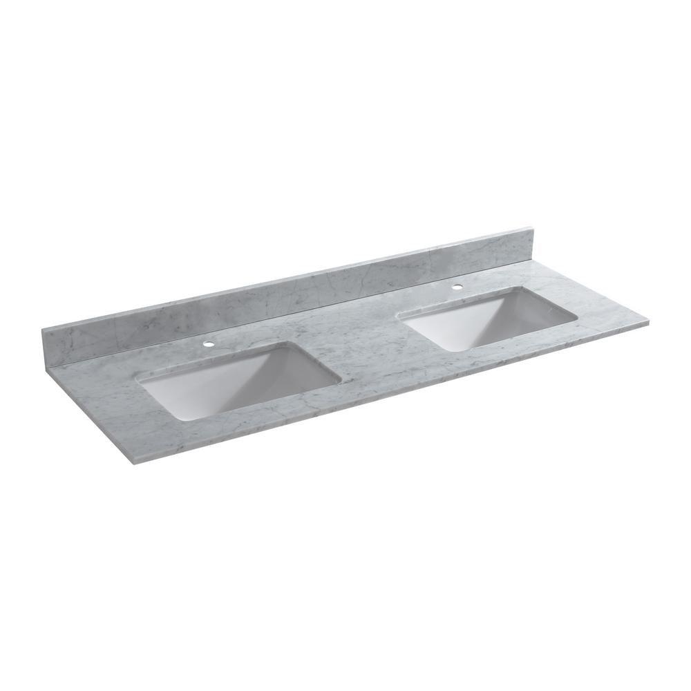 Transform your bathroom with a beautiful marble vanity top with attached under-mount vitreous china sink. Perfect for quick and easy remodels. This marble top is easy to install and fits directly on top of any standard 60 in. vanity cabinet. An attached 4 ft. height backsplash will help protect your wall, and the back of your cabinet, against small splashes and spills. Marble is a natural material and slight variations in color may occur and are natural [dimensions]: Exterior Dimension: 61 in. wide x 22 in. deep. Fits Most Standard 60 in. W x 21 in. D vanity cabinet, single center faucet holes [Elegant and Stylish Top]: Warmly elegant and stylish, Carrara marble vanity top complement most Bathroom designs and coordinate with both light and dark cabinetry. High-end and classic natural stone top Pre-sealed and Polished for added protection. [Easy to Installation]: Top pre-drilled for single faucet, Assembled stylish rectangular white vitreous china under mount bowl with safety overflow hole, This top is perfect for quick and easy remodels. Obtain the beauty and durability of marble without hiring a professional [package included]: Vanity top with assembled rectangular under mount bowl , matching 4 in. high Backsplash. Besides, extremely solid package - very firm carton box with foam is used to transport top, making sure a safe delivery.