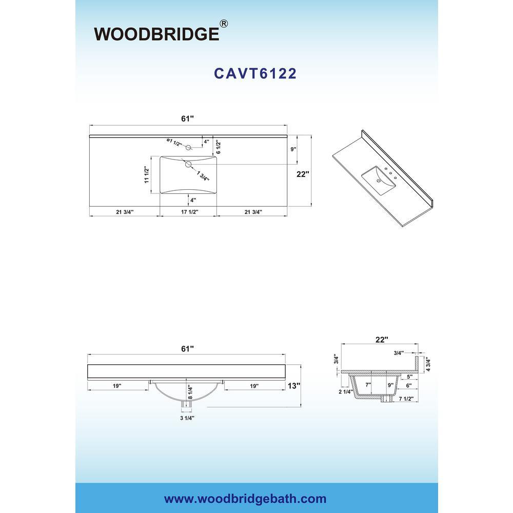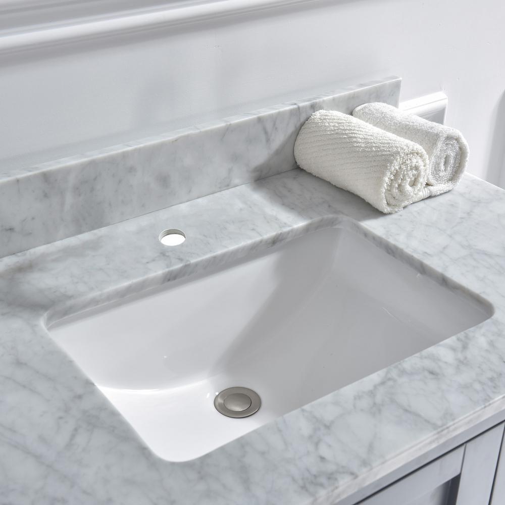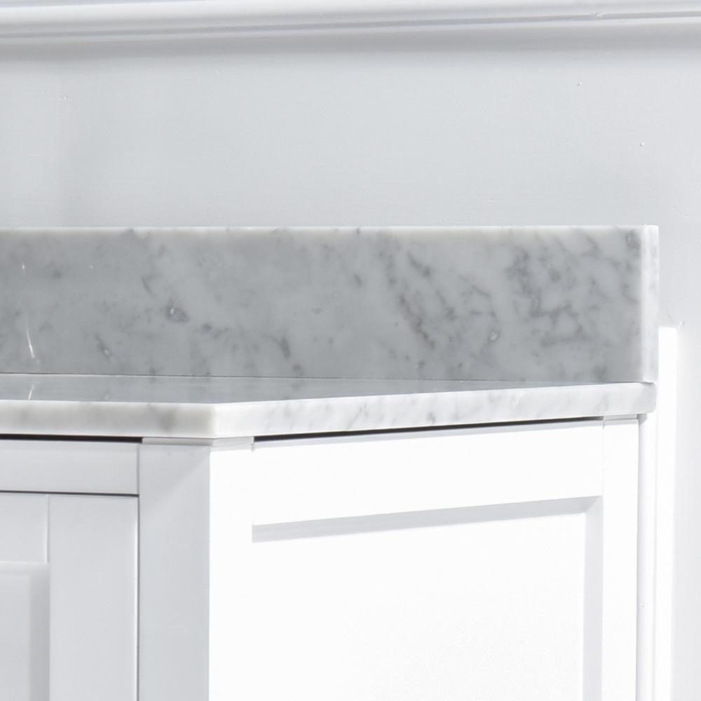Transform your bathroom with a beautiful marble vanity top with attached under-mount vitreous china sink. Perfect for quick and easy remodels. This marble top is easy to install and fits directly on top of any standard 60 in. vanity cabinet. An attached 4 ft. height backsplash will help protect your wall, and the back of your cabinet, against small splashes and spills. Marble is a natural material and slight variations in color may occur and are natural. Dimensions: Exterior Dimension: 61 in. wide x 22 in. deep. Fits Most Standard 60 in. W x 21 in. D vanity cabinet, single center faucet holes Elegant and Stylish Top: Warmly elegant and stylish, Carrara marble vanity top complement most Bathroom designs and coordinate with both light and dark cabinetry. High-end and classic natural stone top Pre-sealed and Polished for added protection. Easy to Installation: Top pre-drilled for single faucet, Assembled stylish rectangular white vitreous china under mount bowl with safety overflow hole, This top is perfect for quick and easy remodels. Obtain the beauty and durability of marble without hiring a professional Package Included: Vanity top with assembled rectangular under mount bowl , matching 4 in. high Backsplash. Besides, extremely solid package - very firm carton box with foam is used to transport top, making sure a safe delivery.