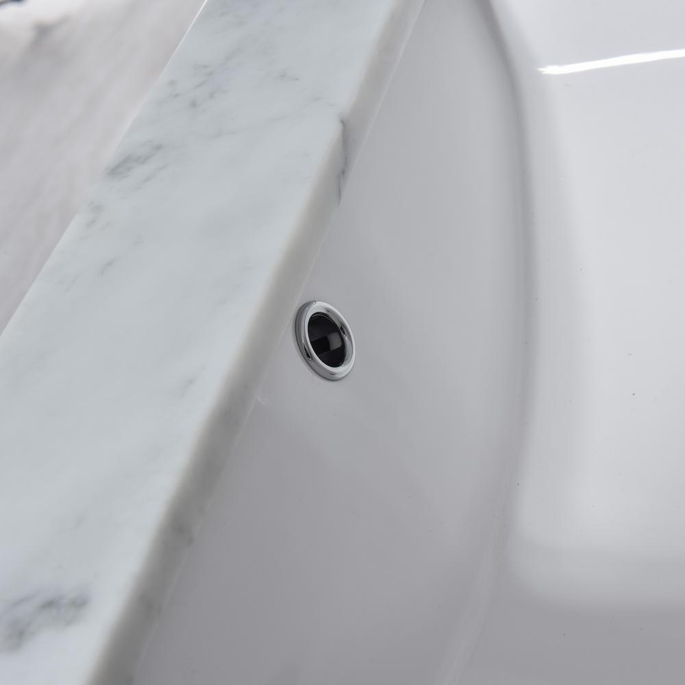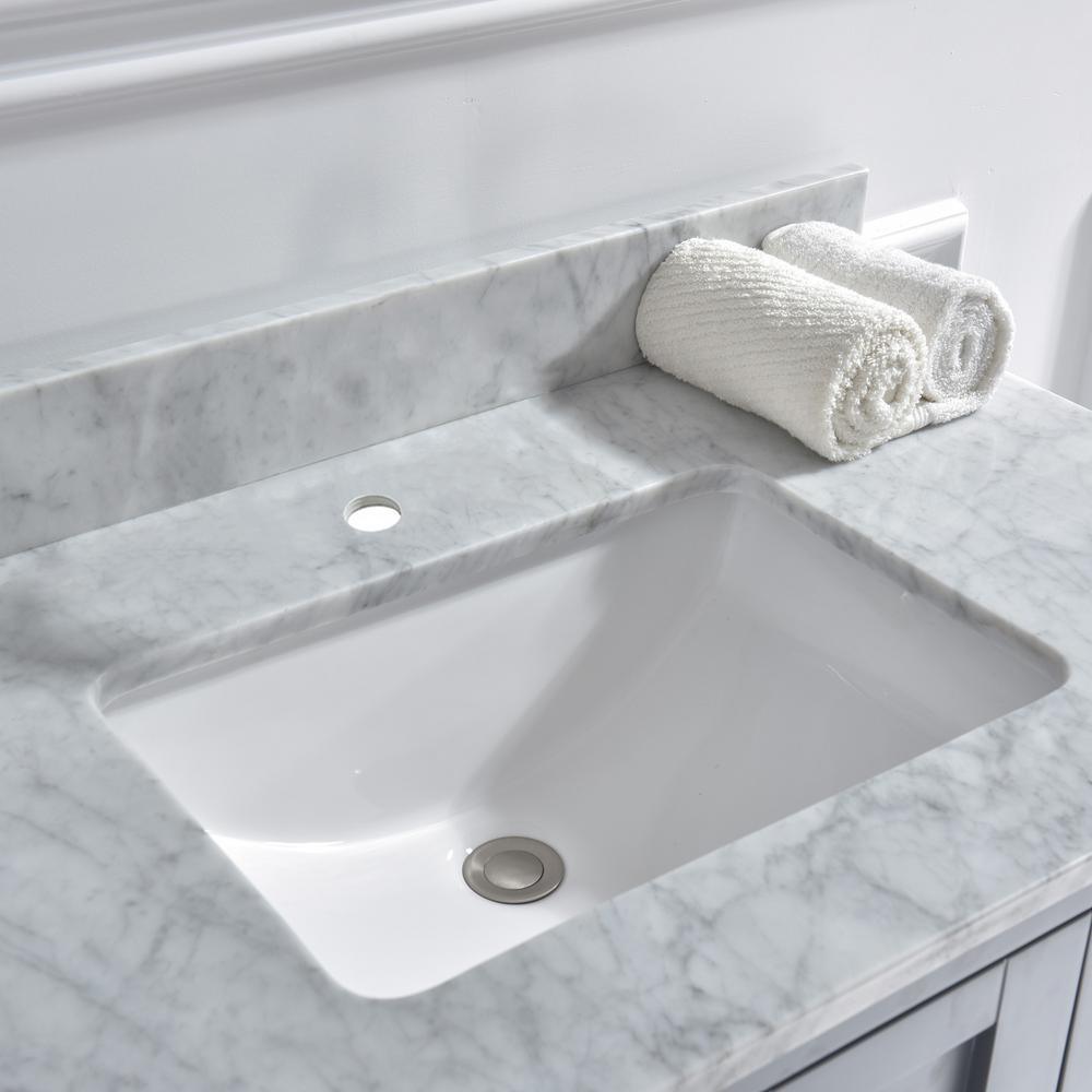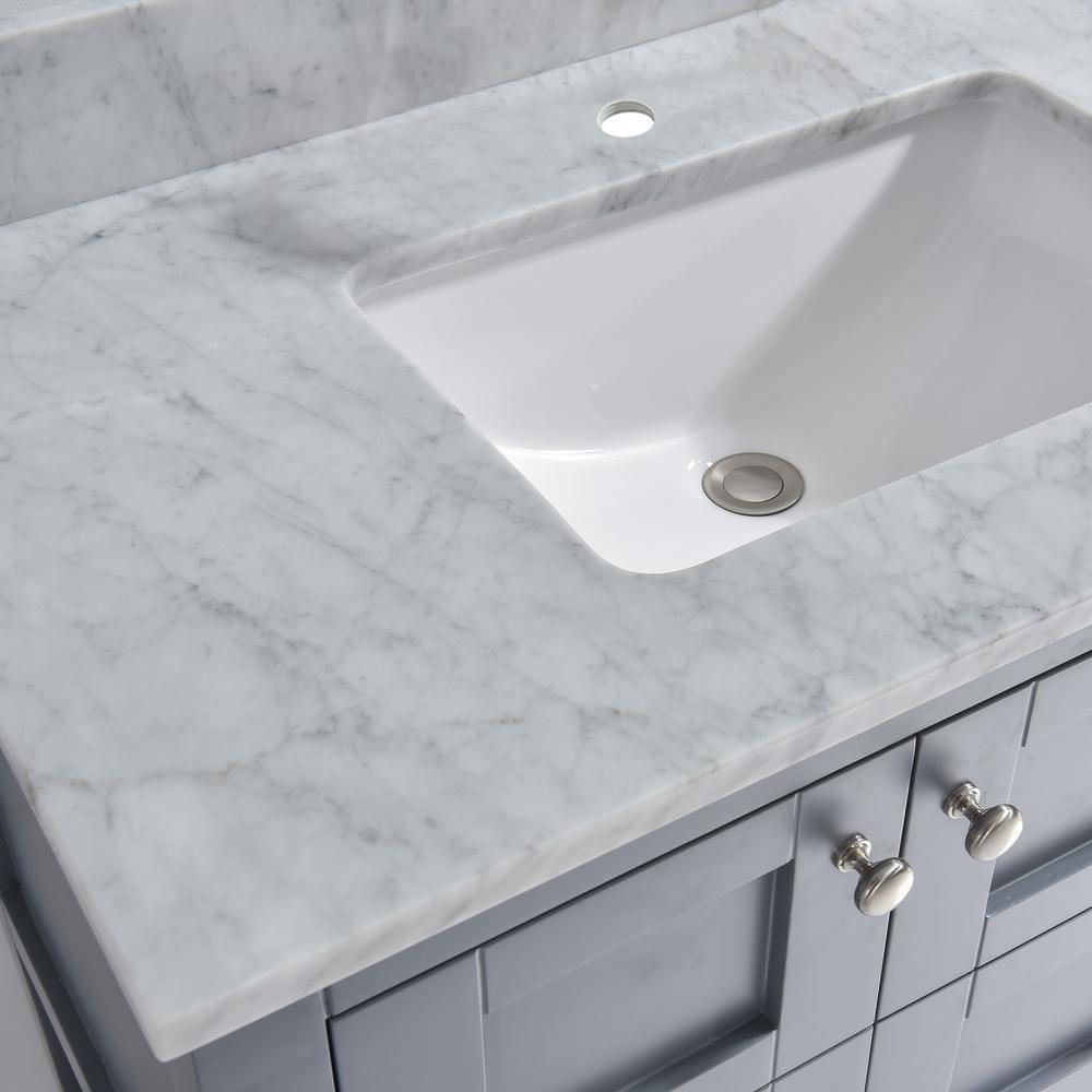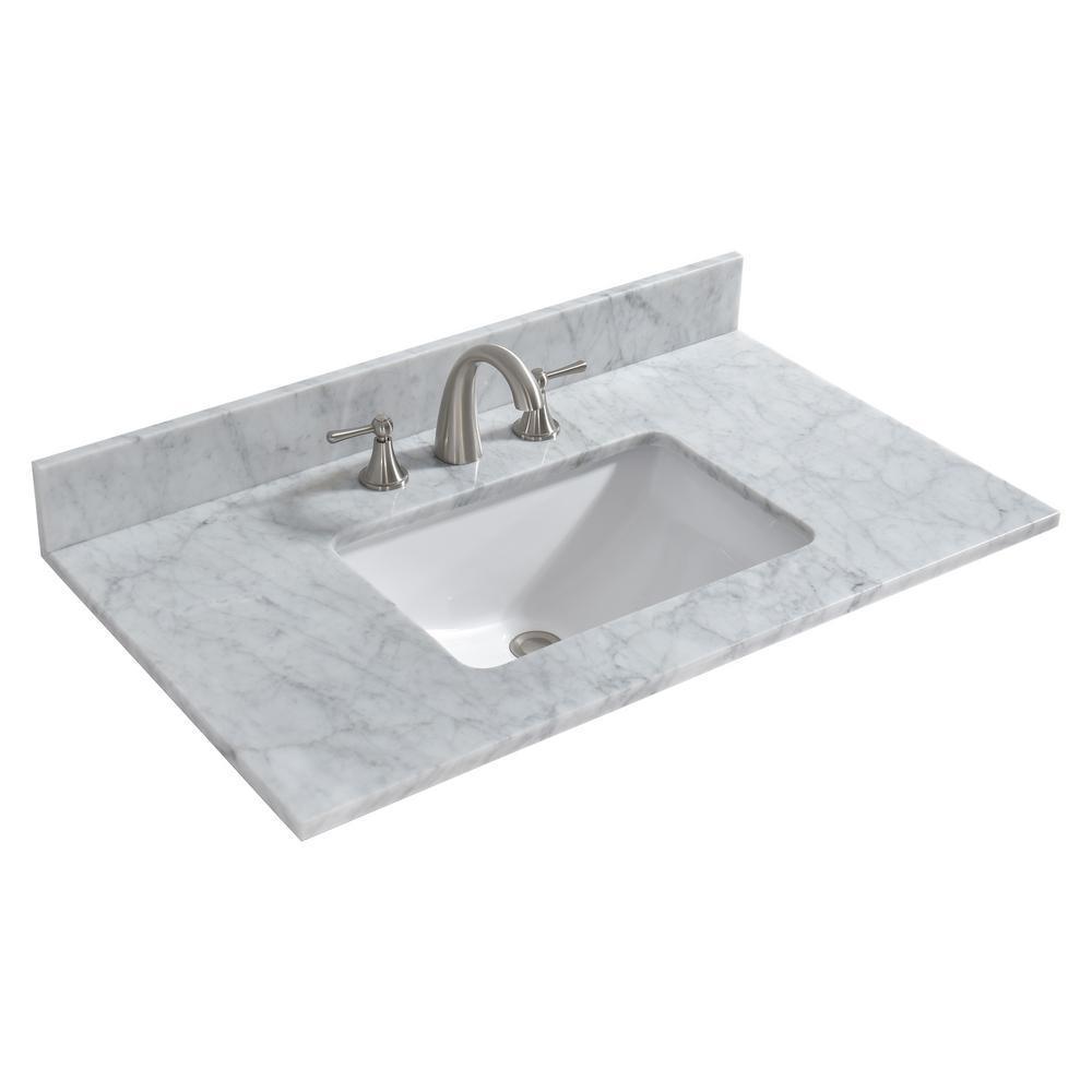 Transform your bathroom with a beautiful marble vanity top with attached under-mount vitreous china sink. Perfect for quick and easy remodels. This marble top is easy to install and fits directly on top of any standard 36 in. vanity cabinet. An attached 4' height backsplash will help protect your wall, and the back of your cabinet, against small splashes and spills. Marble is a natural material and slight variations in color may occur and are natural. ✅ [DIMENSIONS]: Exterior Dimension: 37" wide x 22" deep . Fits Most Standard 36-in W x 21-in D vanity cabinet , single center faucet holes ✅ [Elegant & Stylish Top]: Warmly elegant and stylish, Carrara marble vanity top complement most Bathroom designs and coordinate with both light and dark cabinetry. High-end and classic natural stone top Pre-sealed and Polished for added protection. ✅ [Easy to Installation]: Top pre-drilled for single faucet, Assembled stylish rectangular white vitreous china under mount bowl with safety overflow hole, This top is perfect for quick and easy remodels. Obtain the beauty and durability of marble without hiring a professional ✅ [PACKAGE INCLUDED]: Vanity top with assembled rectangular under mount bowl , matching 4" high Backsplash. Besides, extremely solid package - very firm carton box with foam is used to transport top, making sure a safe delivery.