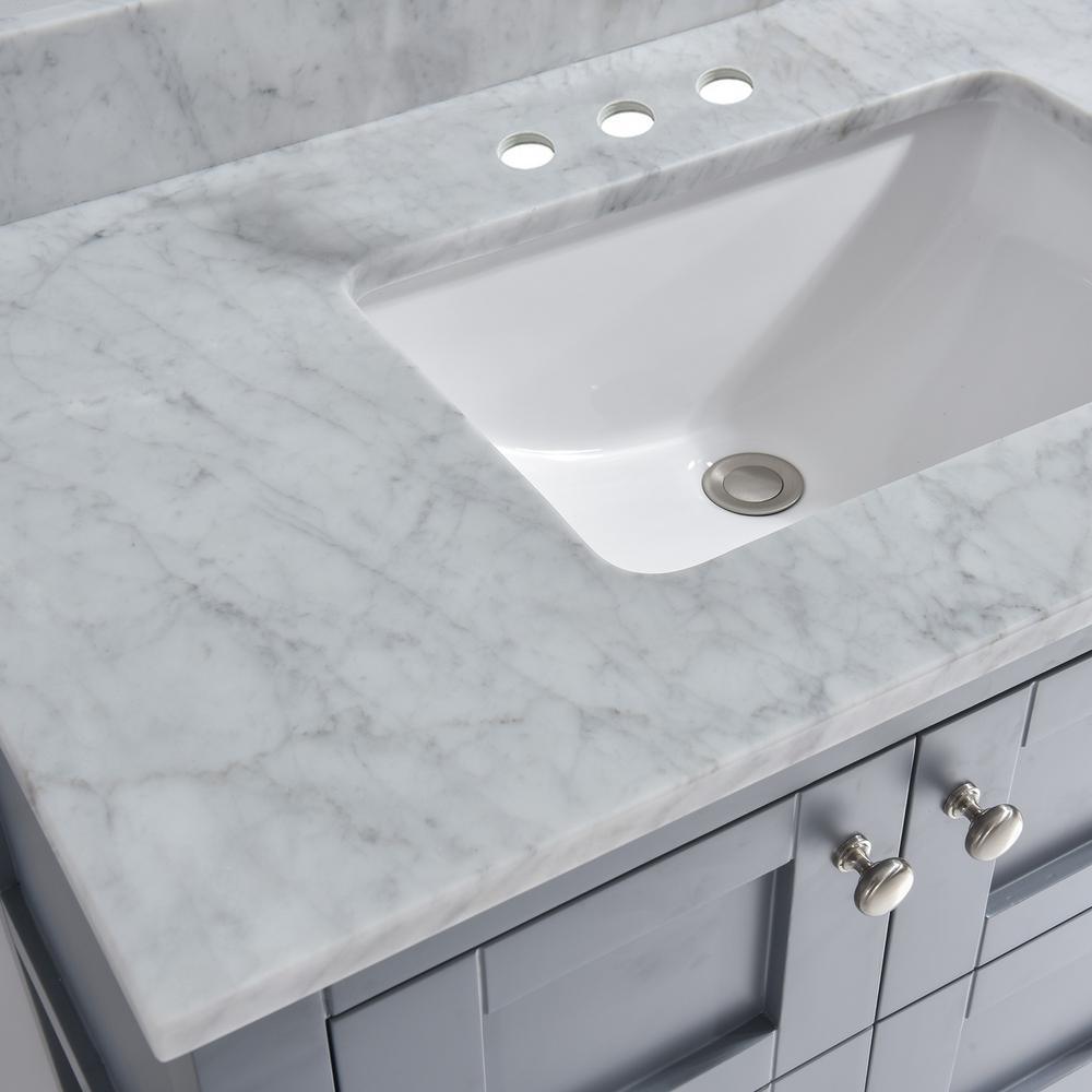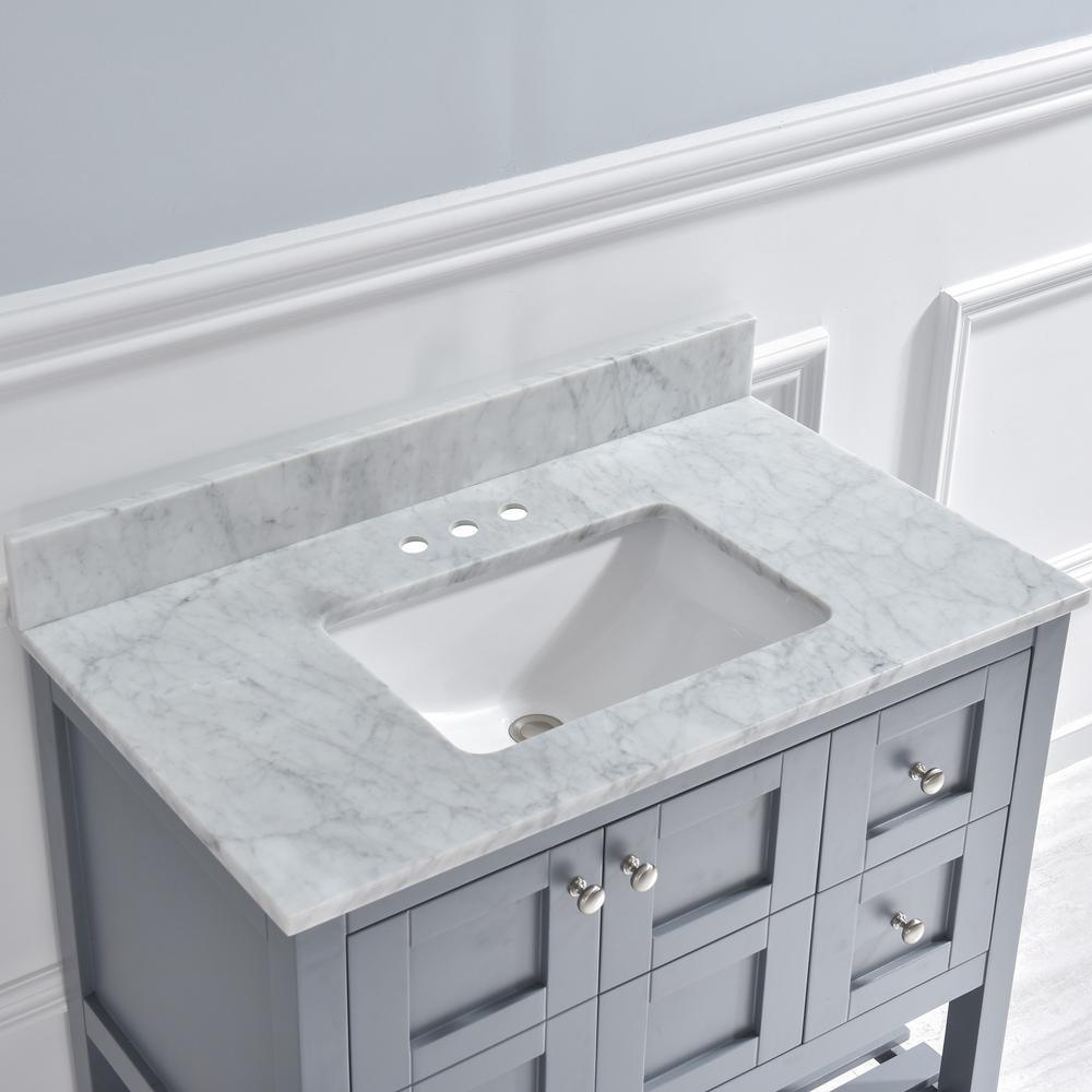 Transform your bathroom with a beautiful marble vanity top with attached under-mount vitreous china sink. Perfect for quick and easy remodels. This marble top is easy to install and fits directly on top of any standard 36 in. vanity cabinet. An attached 4' height backsplash will help protect your wall, and the back of your cabinet, against small splashes and spills. Marble is a natural material and slight variations in color may occur and are natural. ✅ [DIMENSIONS]: Exterior Dimension: 37" wide x 22" deep . Fits Most Standard 36-in W x 21-in D vanity cabinet , 4 inches center faucet holes ✅ [Elegant & Stylish Top]: Warmly elegant and stylish, Carrara marble vanity top complement most Bathroom designs and coordinate with both light and dark cabinetry. High-end and classic natural stone top Pre-sealed and Polished for added protection. ✅ [Easy to Installation]: Top pre-drilled for 4-inch widespread faucet, Assembled stylish rectangular white vitreous china under mount bowl with safety overflow hole, This top is perfect for quick and easy remodels. Obtain the beauty and durability of marble without hiring a professional ✅ [PACKAGE INCLUDED]: Vanity top with assembled rectangular under mount bowl , matching 4" high Backsplash. Besides, extremely solid package - very firm carton box with foam is used to transport top, making sure a safe delivery.