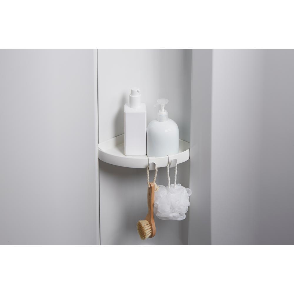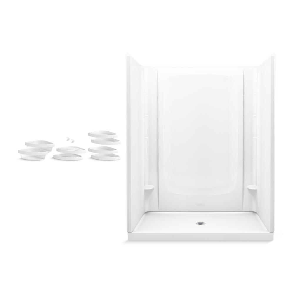 Components include: shower base, shower back wall, shower end wall set, and 10-piece accessory kit