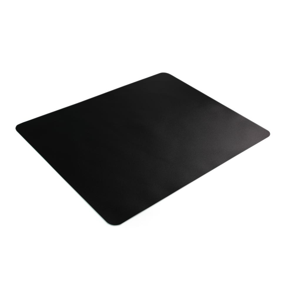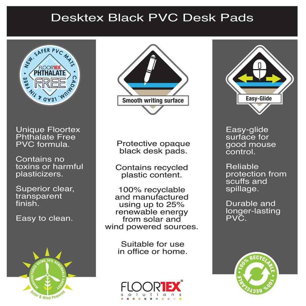 Desktex black PVC is a durable surface protector from our desk pad range, made from vinyl plastic. Simply wipe clean with a damp cloth to remove any dirt build up. Our products are designed to perfectly preserve the condition of every surface they cover. All Polycarbonate and PVC desk pads in the Desktex range are fully recyclable and are manufactured in our facility which obtains 25% of its energy requirements from renewable sources. Proudly designed and manufactured in the UK. Mat size may vary slightly due to manufacturing process.