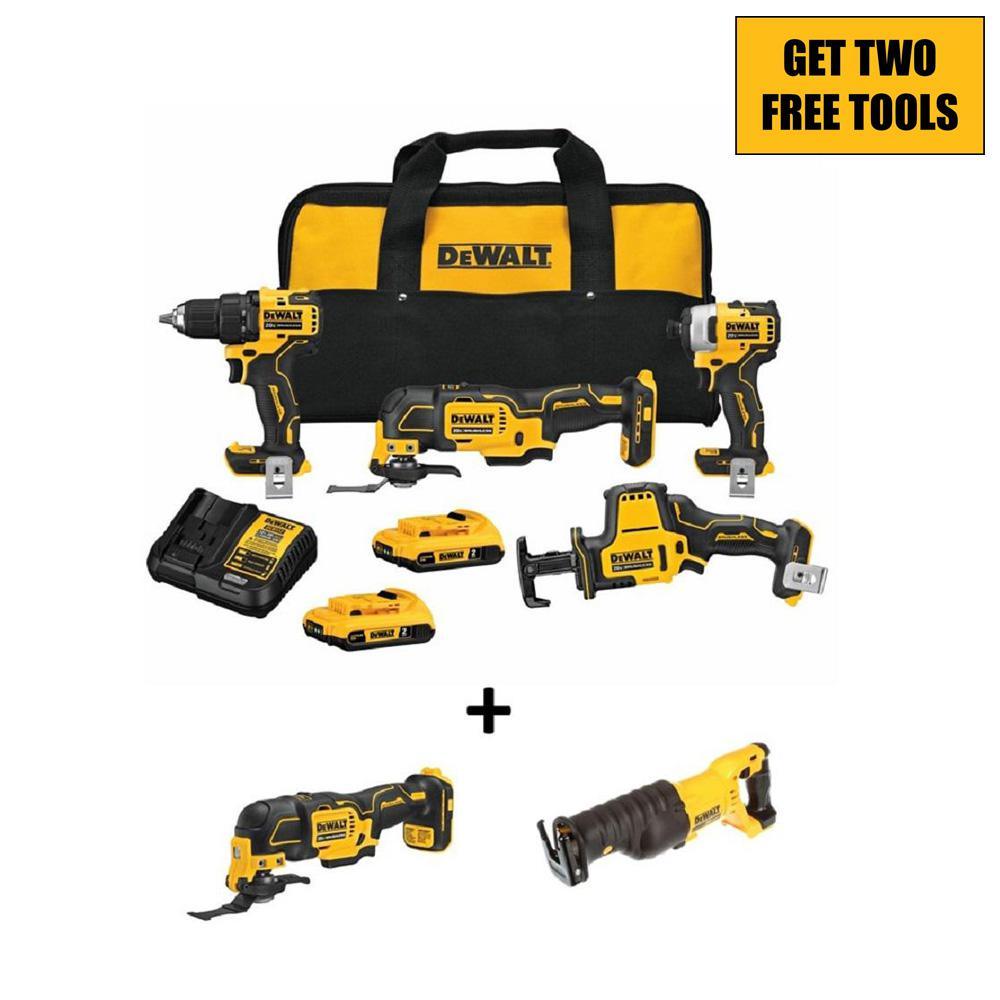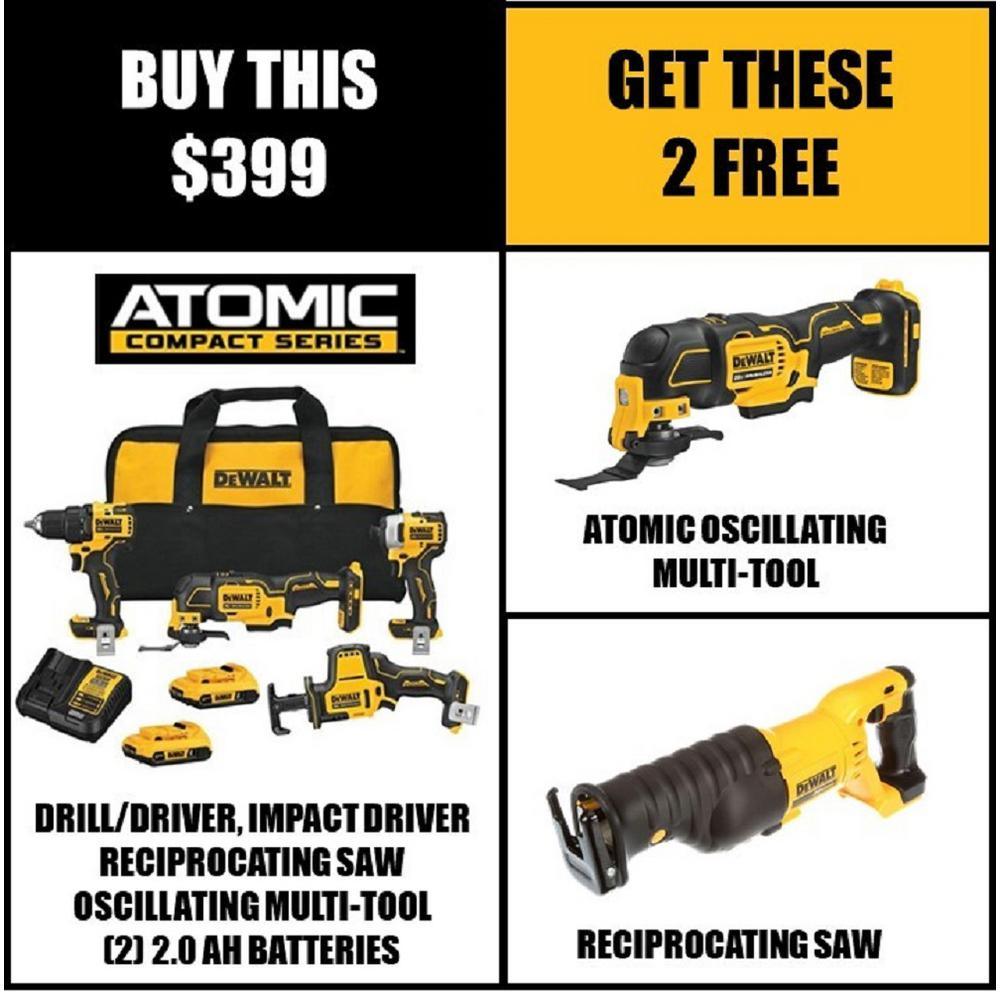 This ATOMIC Compact Series 20-Volt MAX Cordless Combo Kit includes one 1/2 in. Drill/Driver, 1/4 in. Impact Driver, 1-Handed Reciprocating Saw, Oscillating Multi-Tool, charger, kit bag and two 20-Volt MAX 2.0 Ah batteries. The DCD708 Drill/Driver is compact at only 6.3 in. front to back and its high-performance Brushless Motor delivers 340 unit watts out (UWO). The DCF809 Impact Driver features a high-performance Brushless Motor that delivers 1,700 in./lbs. of max torque. The DCS354 Oscillating Multi-Tool has a DUAL-GRIP variable-speed trigger that provides increased speed and application control. The DCS369 1-Handed Reciprocating Saw is lightweight at only 3.13 lbs., making it 37% lighter than the DCS367 Compact Reciprocating Saw (Tool-Only).