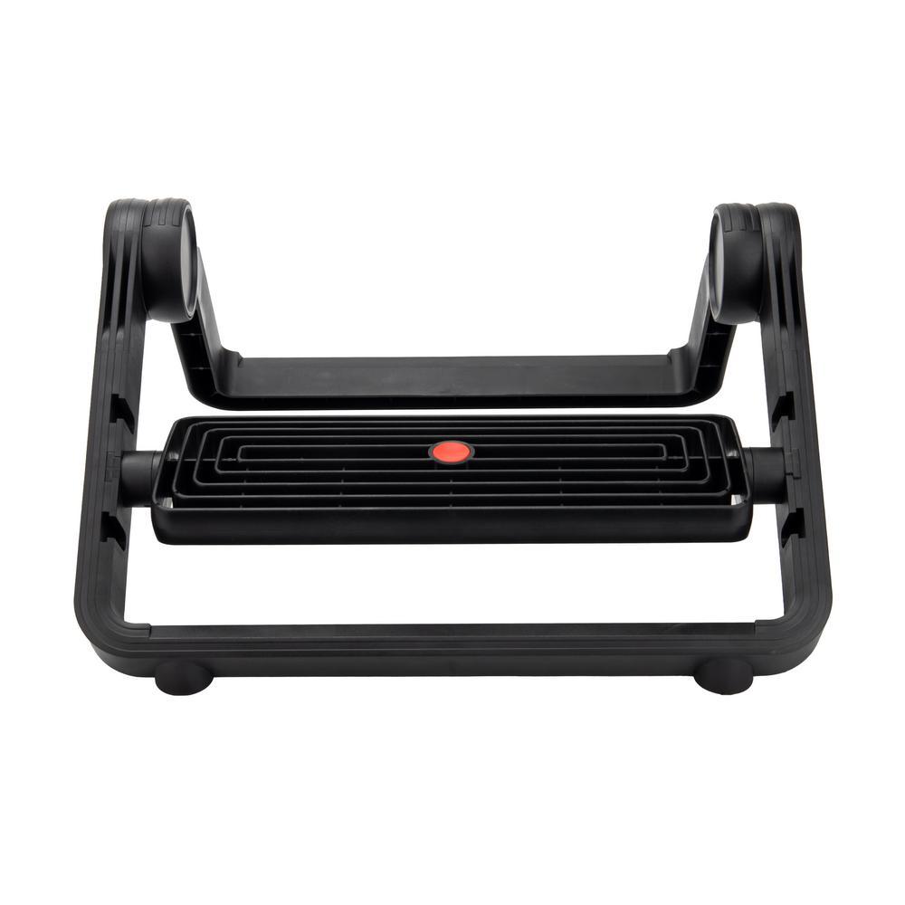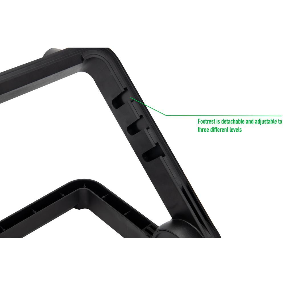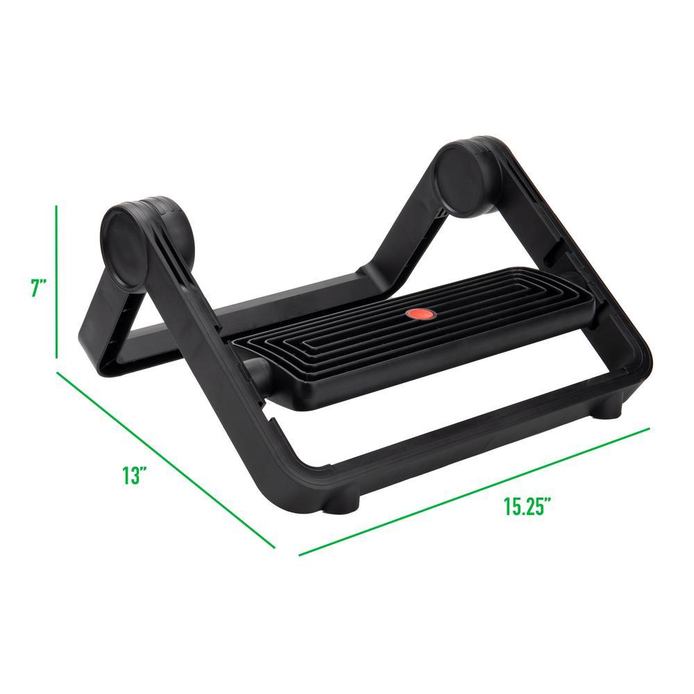 Encourage proper posture while sitting with a Mind Reader Adjustable Footrest. Whether you're working from home or the office, sitting down at a desk for extended periods can often result in muscle aches and pains throughout the body. Ideally, you should be sitting at your desk with your legs at a 90-degree right angle to maintain comfort and circulation throughout the day. Many individuals struggle to sustain this posture due to having chairs at an unsuitable height or legs being too short or too long to accommodate sitting. Enter the active footrest, which can help put your legs at the correct height and angle to preserve the proper form and alleviate tension and muscle pain. This sturdy ergonomic footrest allows you to rest your feet comfortably at an angle conducive to proper posture, without having your legs dangling in the air or stretched out awkwardly. Non-skid feet at the front and rear of the unit protect against sliding on smooth flooring. Tilt the footrest backward and forward throughout the day to engage your leg muscles and keep the blood flowing through your extremities. Detach the step and insert it into one of three slots to position it at your ideal height. The textured surface helps to massage the soles of your feet while simultaneously preventing them from slipping. The plastic step material provides strong, lightweight support, and the collapsible design makes the footrest easy to take with you to the office or traveling.