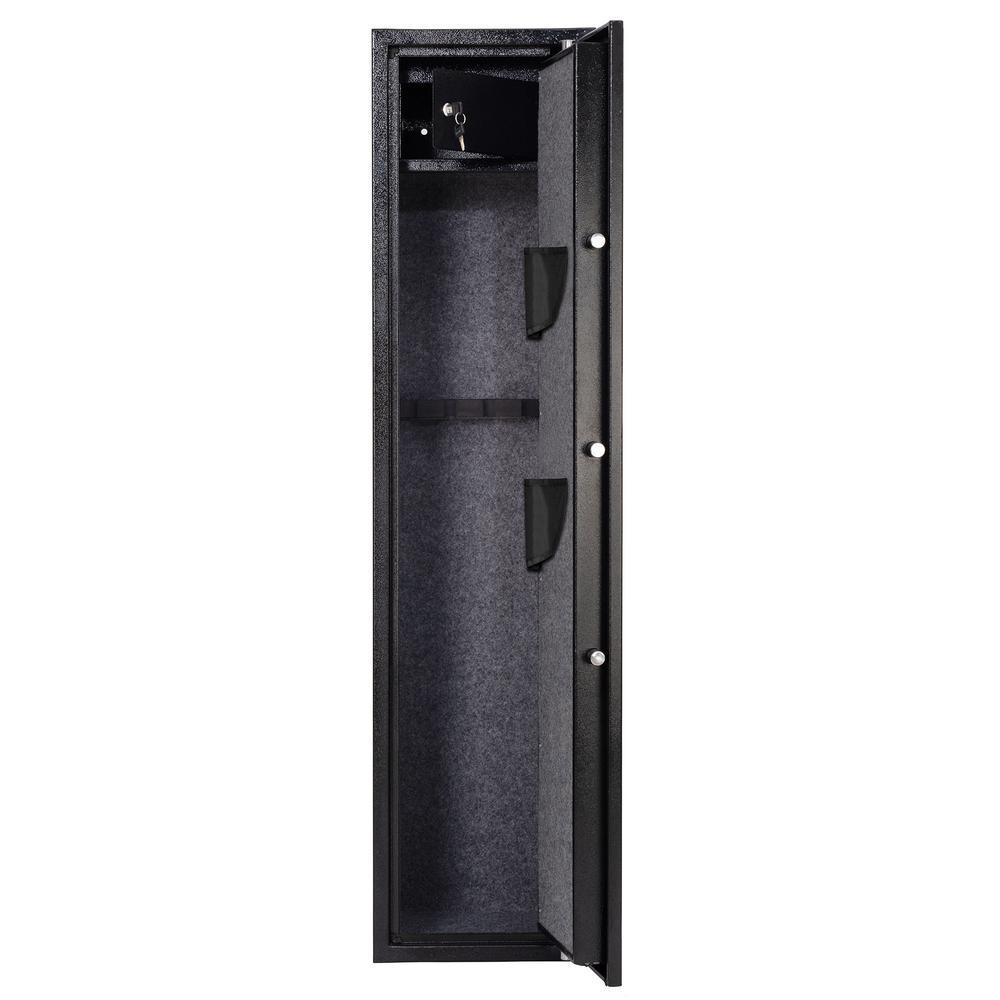 It is a Larger and Deeper Long Rifle Safe with separate Handgun lock box. The gun safe is Larger and deeper than similar ones. The product fits practically anywhere for up to 5 rifles up to 50 in. L with or without scopes. It also has a separate lockbox inside to store bullets, handgun, money and other valuables in your home or office.