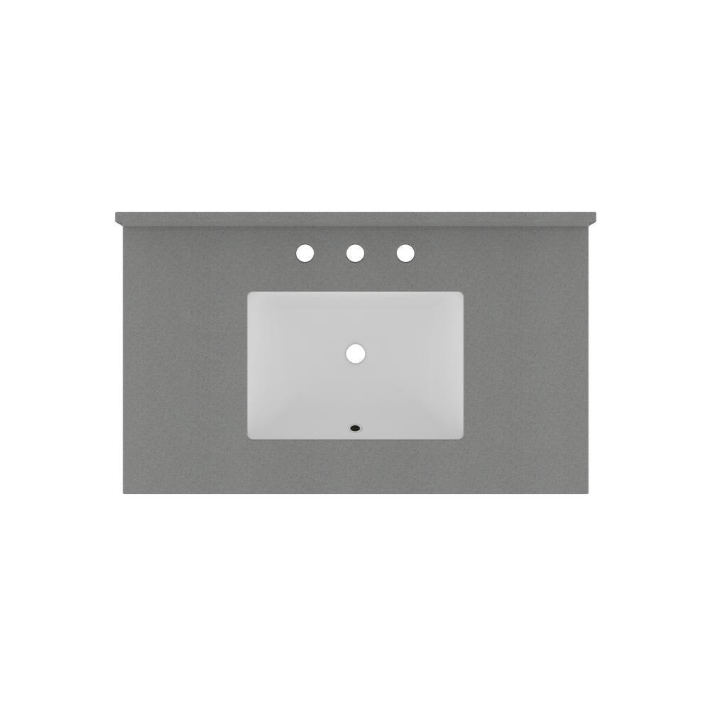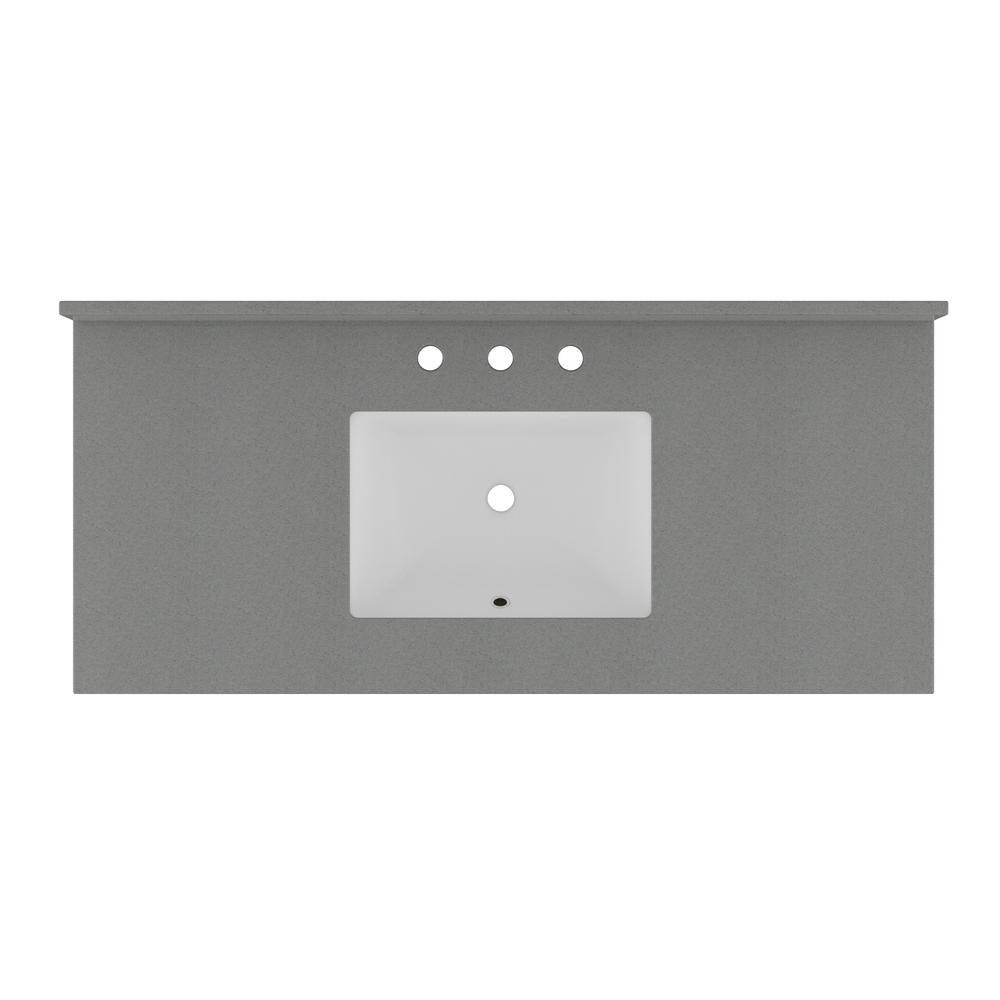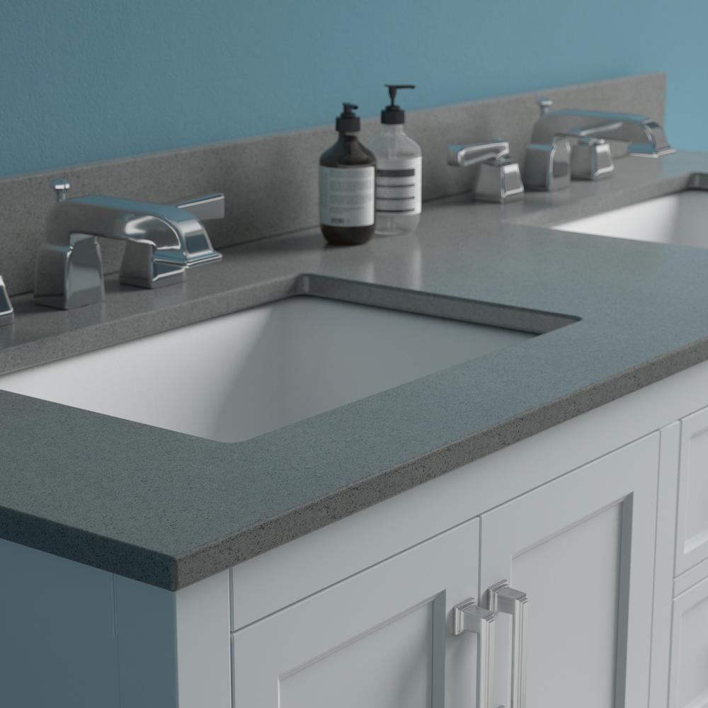 Add a new elegance to your bathroom with a gorgeous new quartz vanity top. The Galaxy Grey Quartz vanity top features pre-attached large rectangular white vitreous china trough bowl and standard edge profile. Perfect addition to an old vanity needing an update or a new vanity, this vanity top will polish off any bathroom.