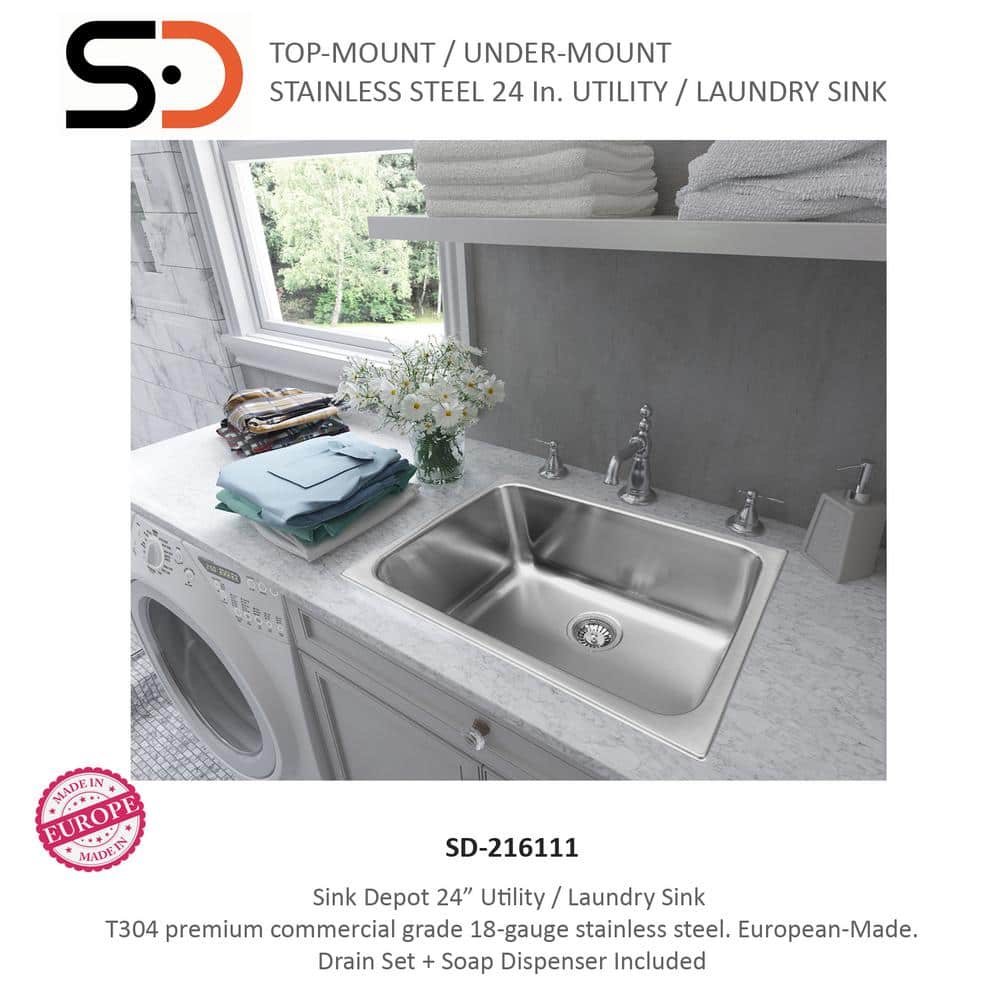 The SINK DEPOT 24 in. x 18 in. Stainless Steel Utility Sink combines style and function for any laundry or utility space. Made from high-quality 18-gauge, commercial-grade stainless steel, this sink is designed for strength, durability, and lasting visual appeal. With the flexibility to mount as a drop-in or undermount sink, it offers a deep basin that enhances your workspace for a variety of tasks.
