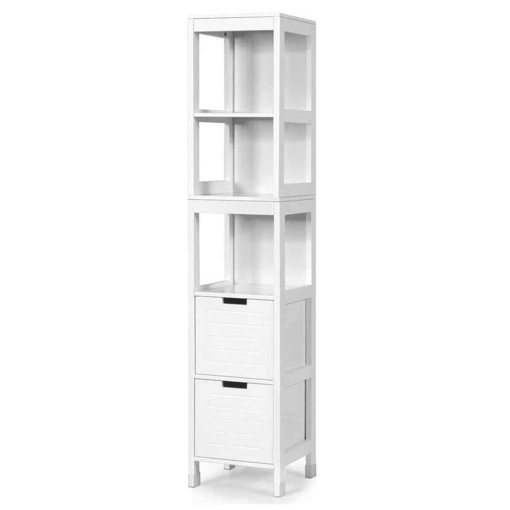 The storage cabinet is made of high quality P2 MDF and environmentally friendly paint. It is not only waterproof and moisture proof, oil resistant and corrosion resistant functions, and its overall structure is very stable. It has anti-toppling fitting and drawer stopper safety design. Five large-capacity shelves and two large drawers allow you to organize and store more items according to your needs.