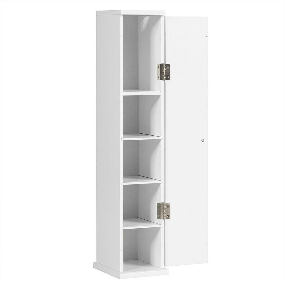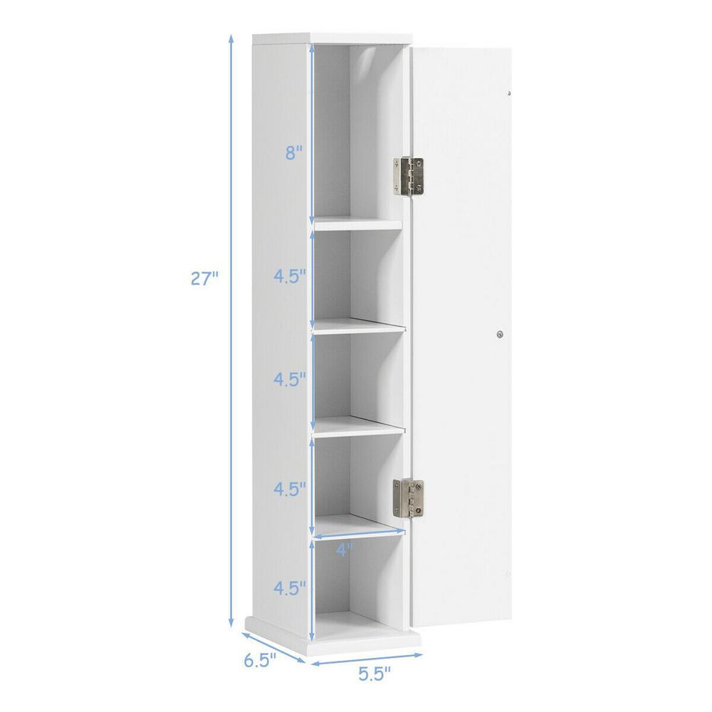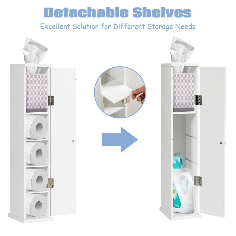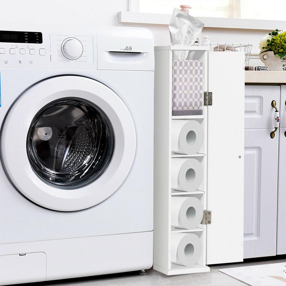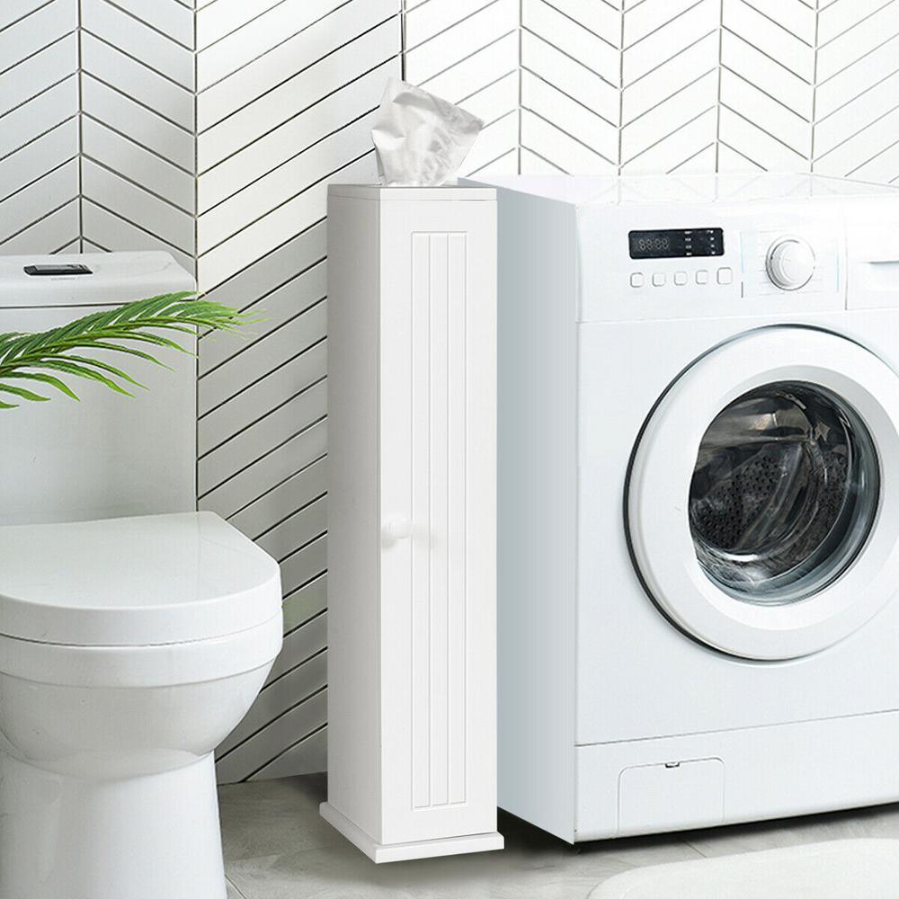 This paper towel cabinet provides excellent storage solutions for bathrooms with limited space. With a dimension of 5.5" (L) x 7" (W) x 27" (H), this cabinet is suitable for narrow space in bathroom and provides you with ample storage space for roll papers and other toilet items. Three detachable shelves give you access to customized storage heights. Featuring sturdy MDF construction, this cabinet with white finish will match with any existing decor. And it is also easy to clean. It is purpose in a slim space at a great value, fit the perfect size between the sink vanity and toilet, between the wall and dryer, between the toilet and the tub. With its fine workmanship, this paper towel cabinet is the best choice for you!