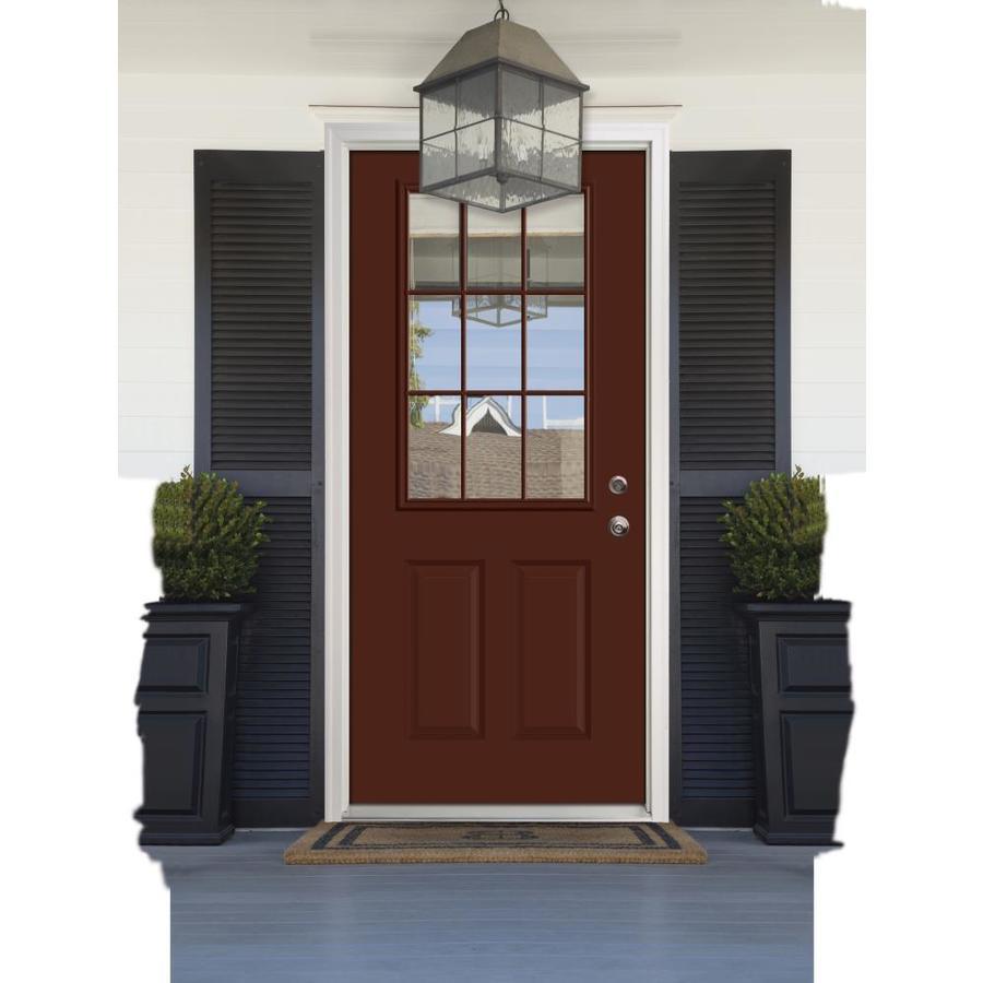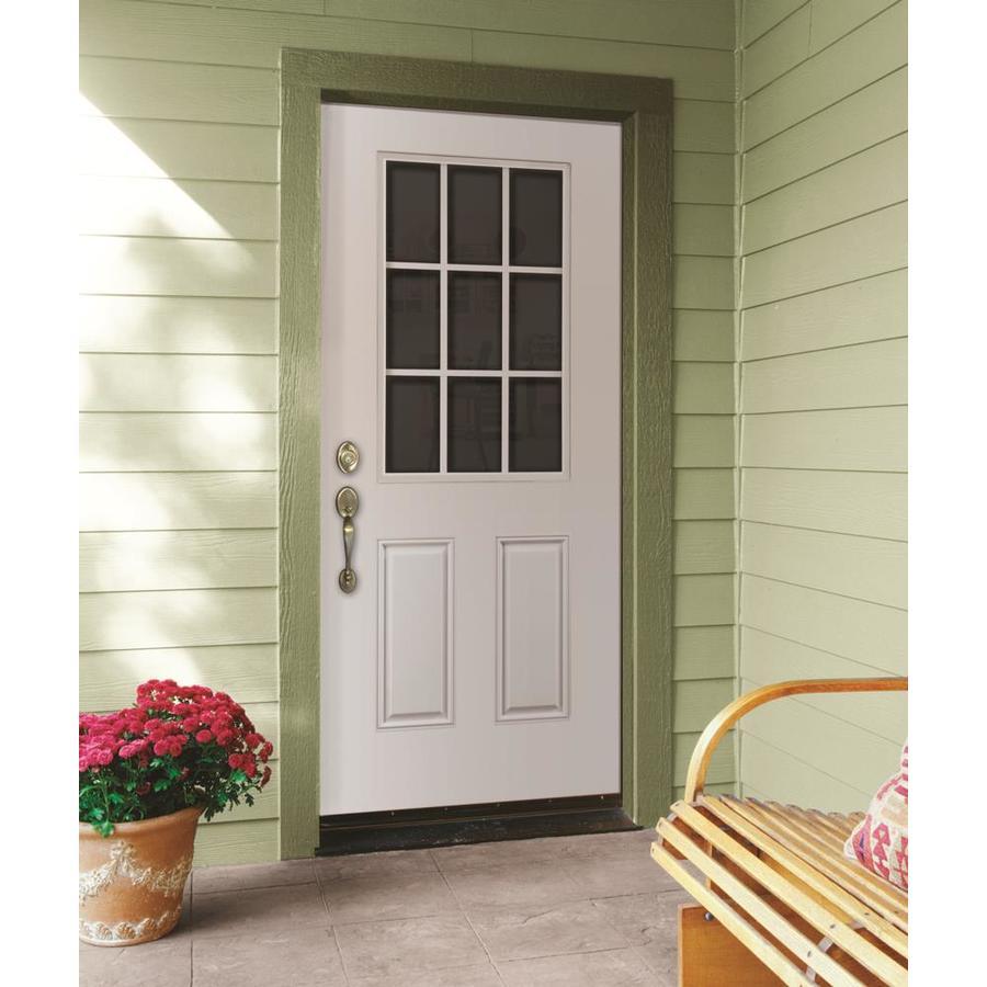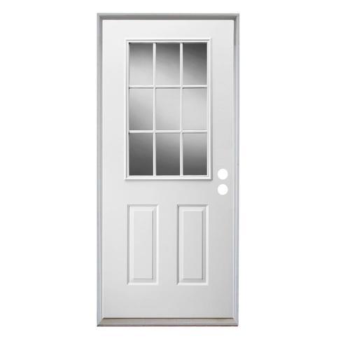 2-panel entry door is double coated with baked-on enamel primer for easier finishing Steel construction is resistant to shrinking, swelling and warping, making it a perfect low-maintenance option for your home 9-lite decorative glass with low-e insulation protects your home’s interior from UV rays and allows the sunlight to naturally brighten your foyer ENERGY STAR® certified products help you save money on utility bills without sacrificing performance, style or comfort Insulating core creates a protective barrier from heat and cold, and also provides exceptional sound insulation so you can relax in your home without being disturbed by outside noise 12-in solid wood lock block and hidden reinforced steel plate in the door frame improve security and resistance against forced entry Adjustable sill, discreet weatherstripping and leak-resistant door sweep prevent moisture and drafts from entering your home Prehung left-hand inswing door is installed in a primed door frame to fit into an existing entry door opening, making installation easier Limited lifetime warranty protects your investment and gives you peace of mind