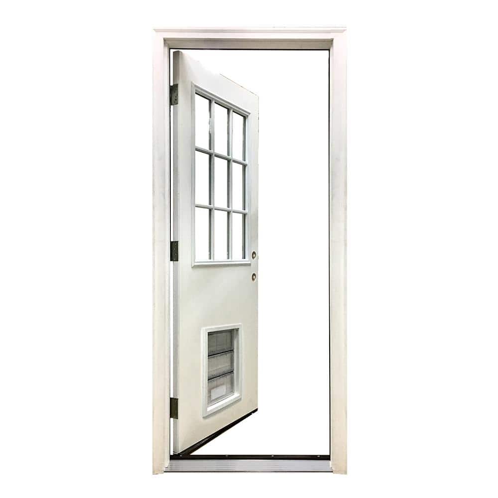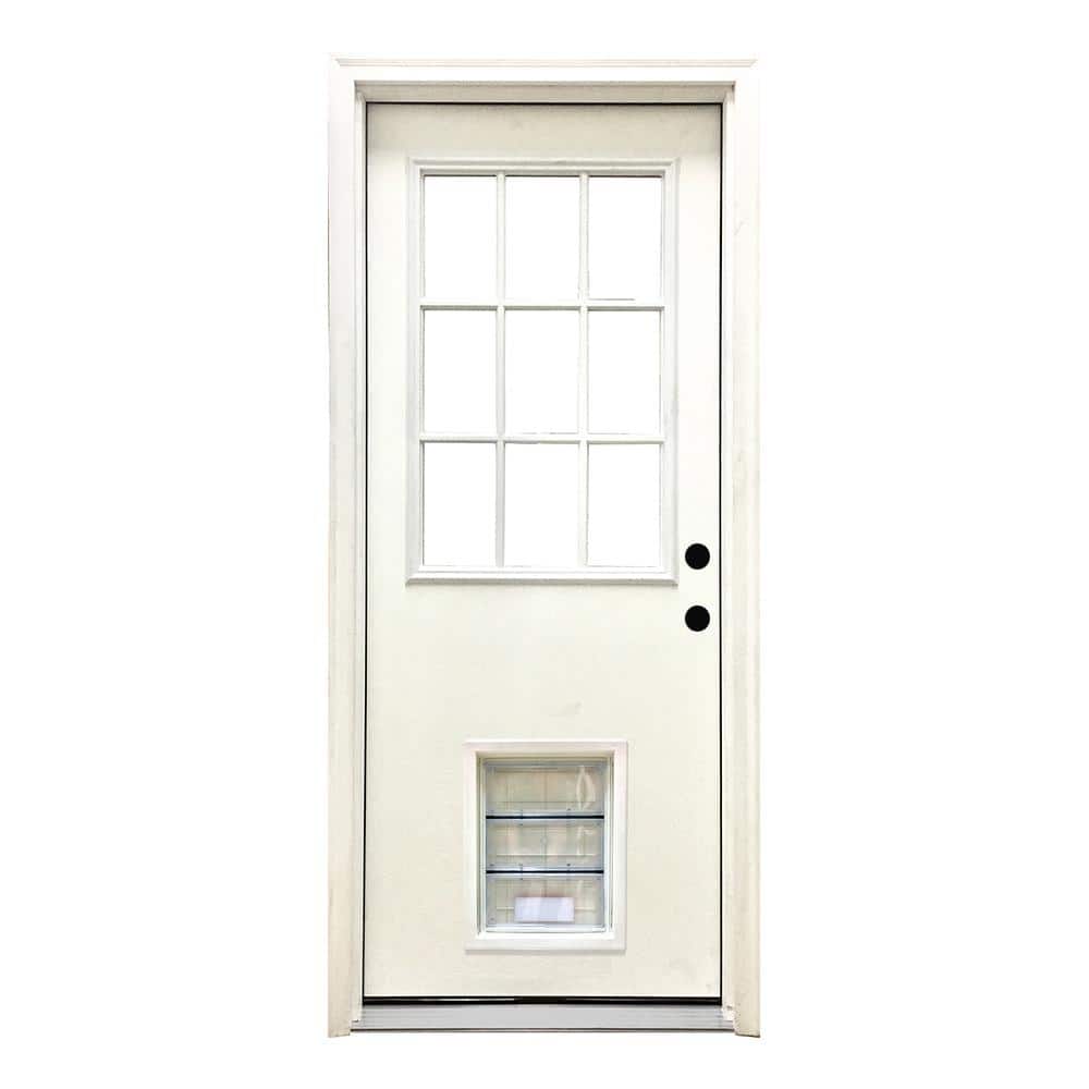 Durable fiberglass exterior back door prehung in a primed 4-9/16 in. frame for easy installation. Clear 9-lite tempered Low-E glass brightens your entry while the integrated large pet door offers convenient access for pets up to 90 lb. Left-hand inswing with double lockset bore and weatherstripping for a tight seal.
