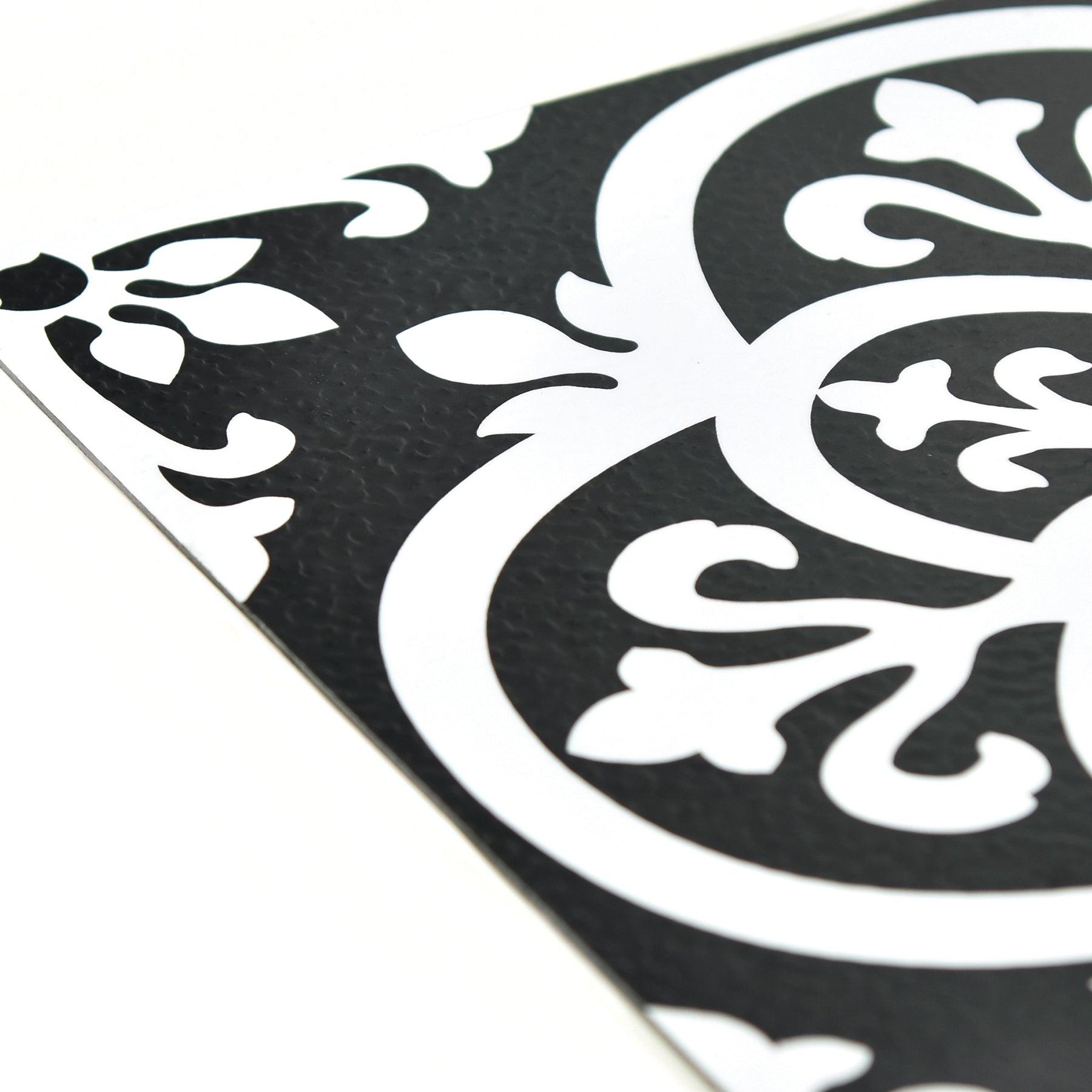 Perfect for creating a bold statement or for the farmhouse enthusiast, these peel and stick floor tiles feature a timeless black and white gothic motif that will elevate the look of dated floors