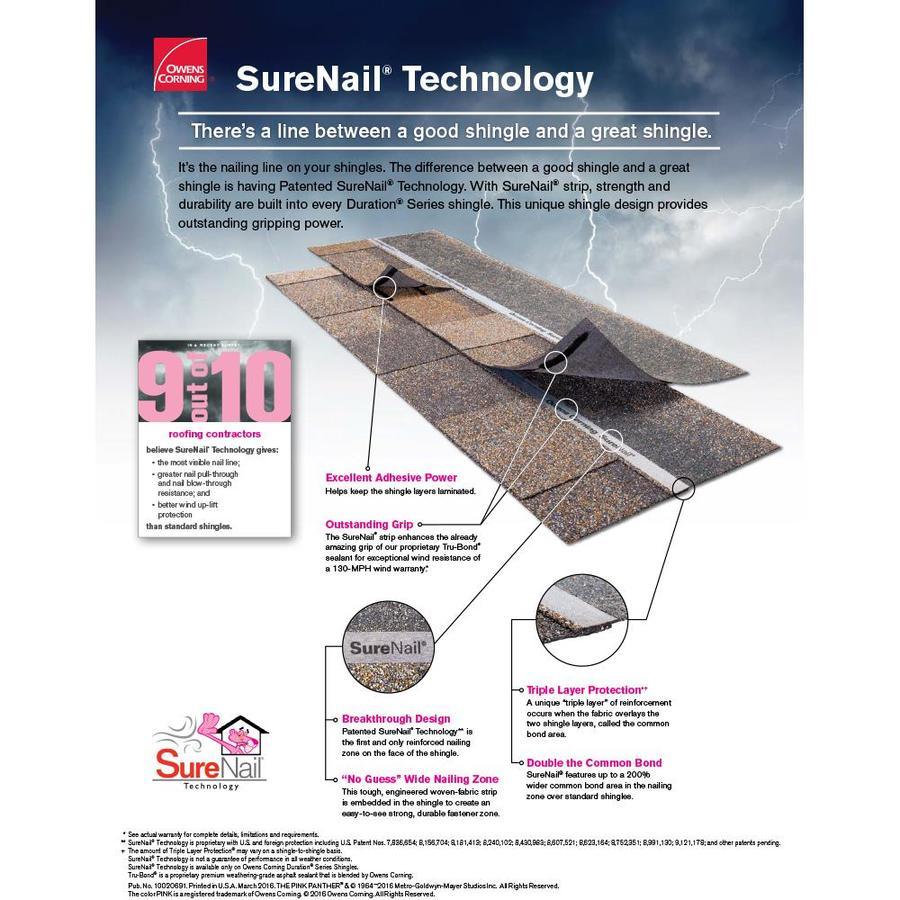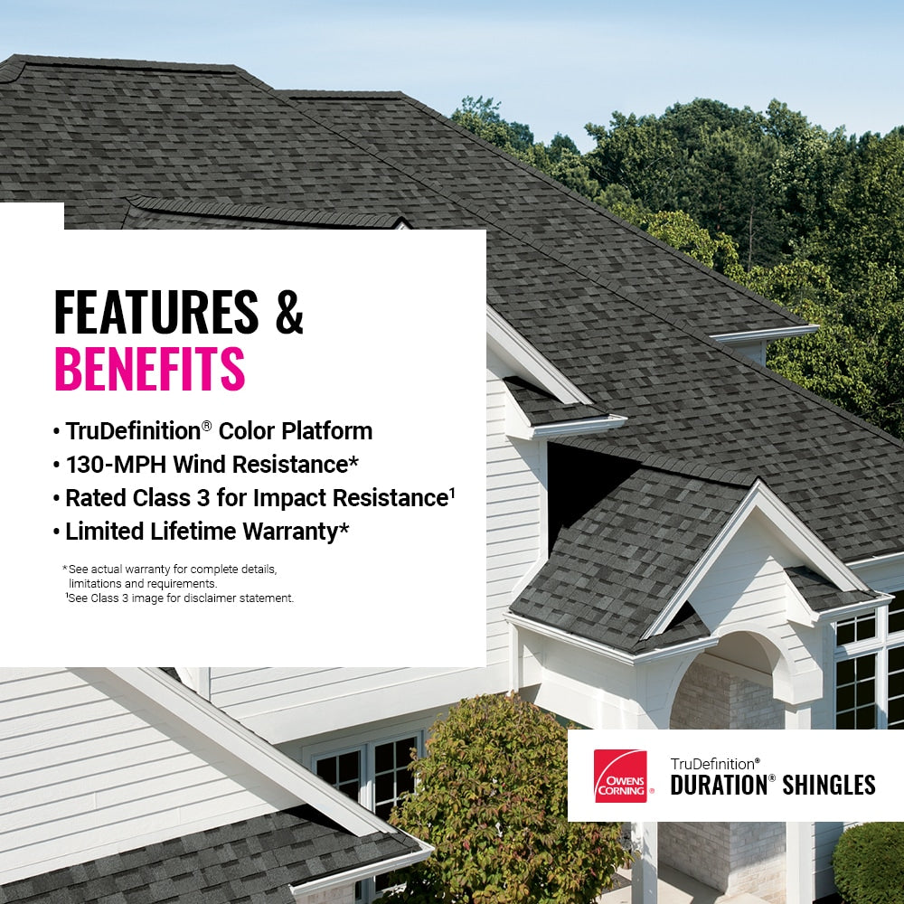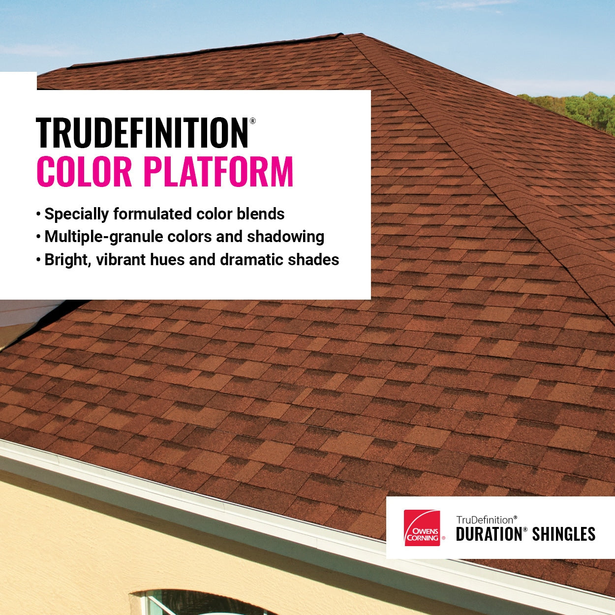 Upgrade your roof with Owens Corning TruDefinition Duration architectural shingles, engineered for long-lasting performance and standout curb appeal. Patented SureNail Technology delivers triple-layer reinforcement in the nailing zone for superior holding power and 130-MPH wind resistance, while StreakGuard algae protection helps prevent black streaks.