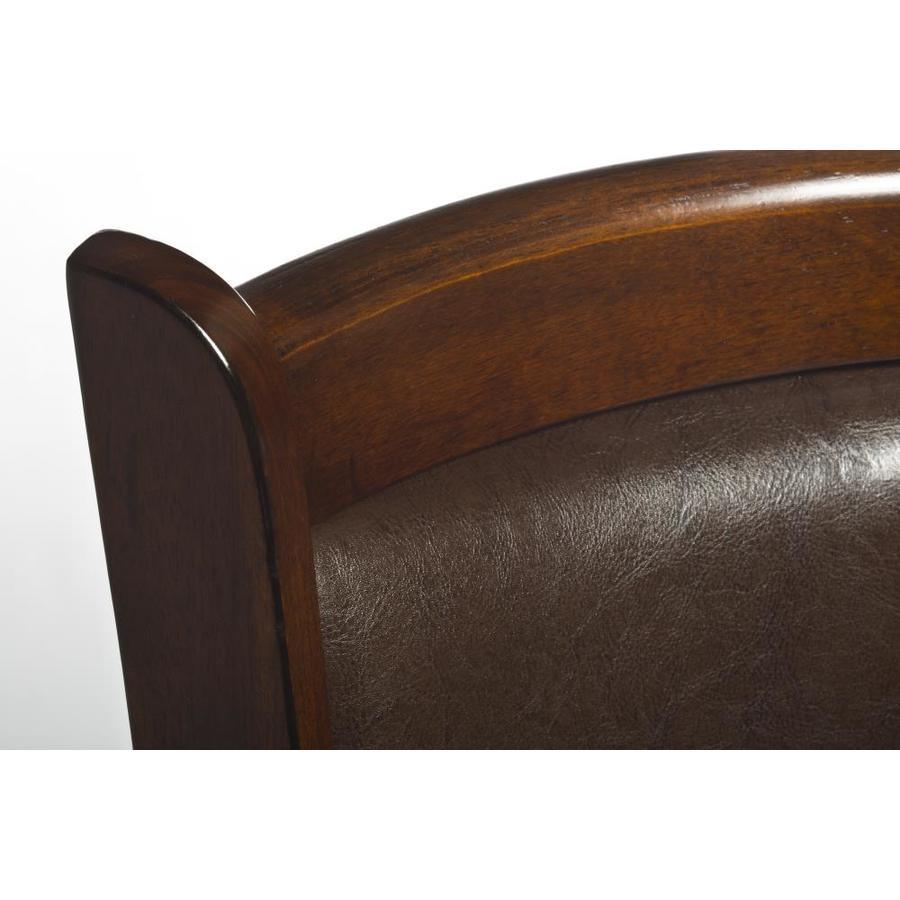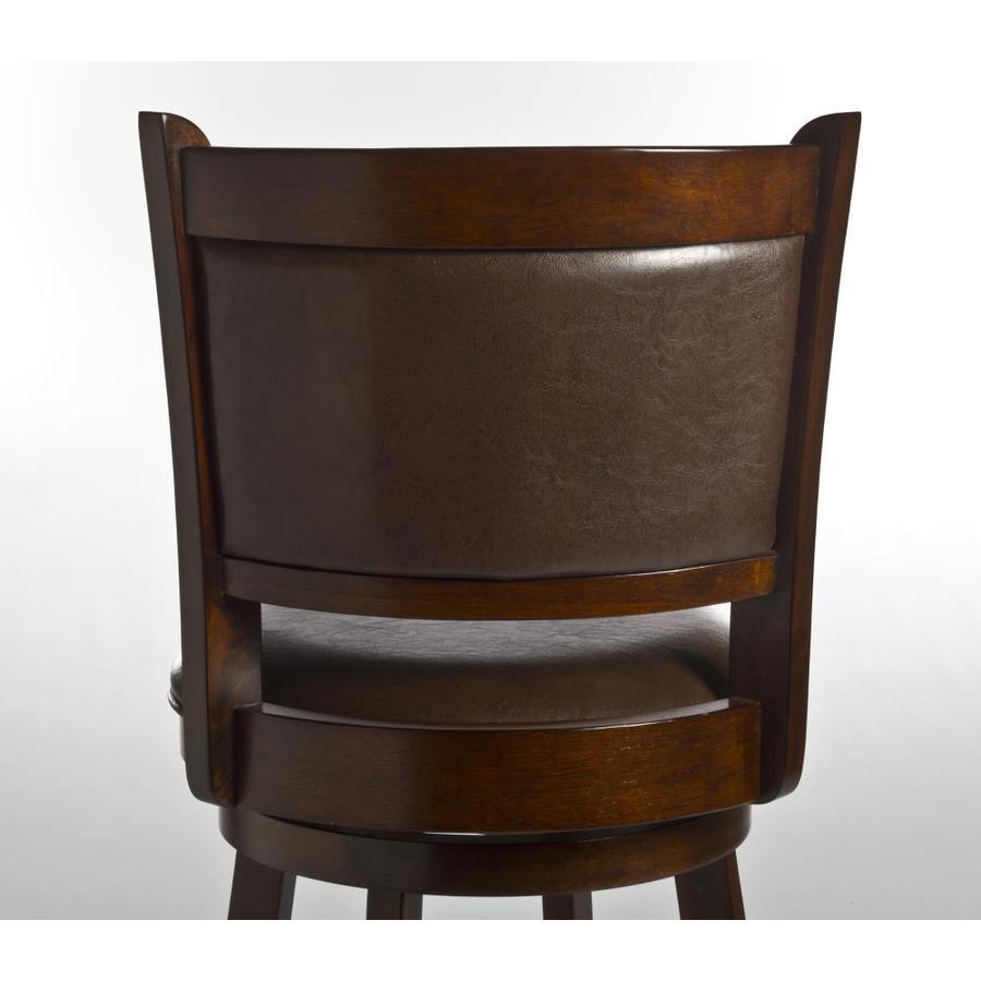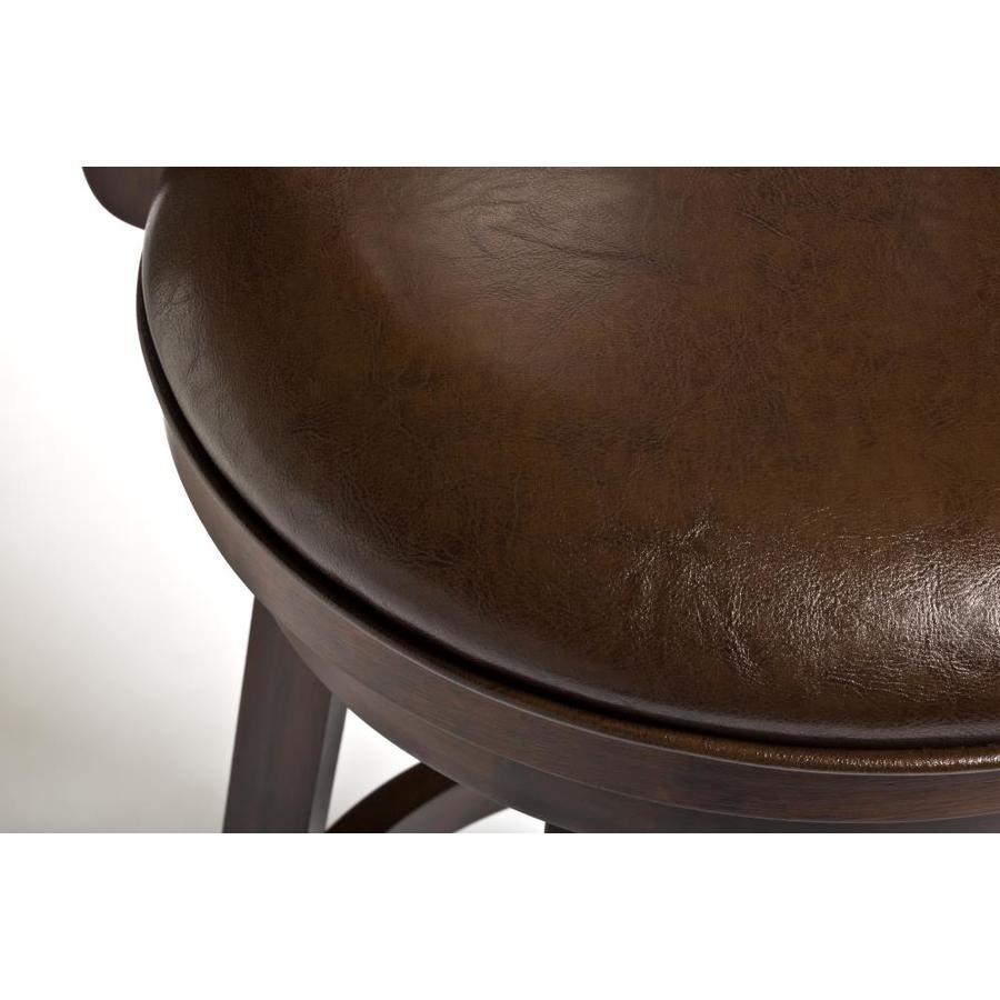 Transitional wood bar height stool with 360 ° swivel The wood frame features a cherry finish accented by a brown vinyl upholstered seat Overall dimensions: 41.75H x 19D x 17.5W; seat height: 30H Assembly required