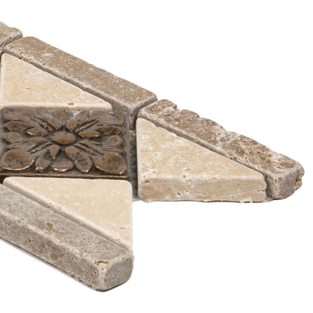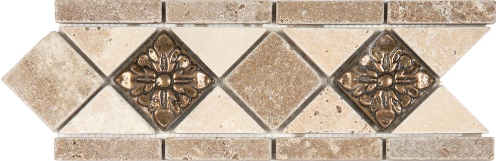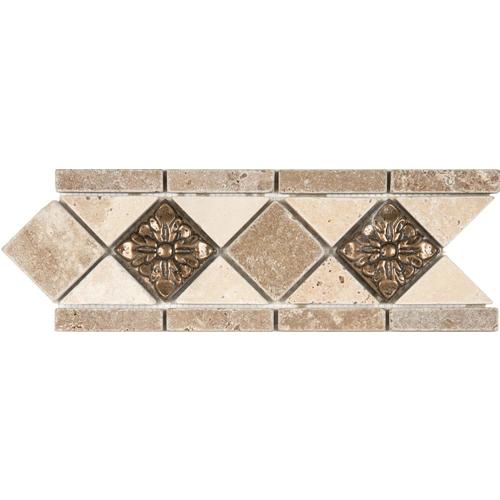 Decorative natural stone travertine listello in Noce and Chiaro with metal accents adds a refined border to walls, backsplashes, and floors. Tumbled finish with textured surface delivers a rustic, aged look while durable stone construction suits residential or commercial interiors.