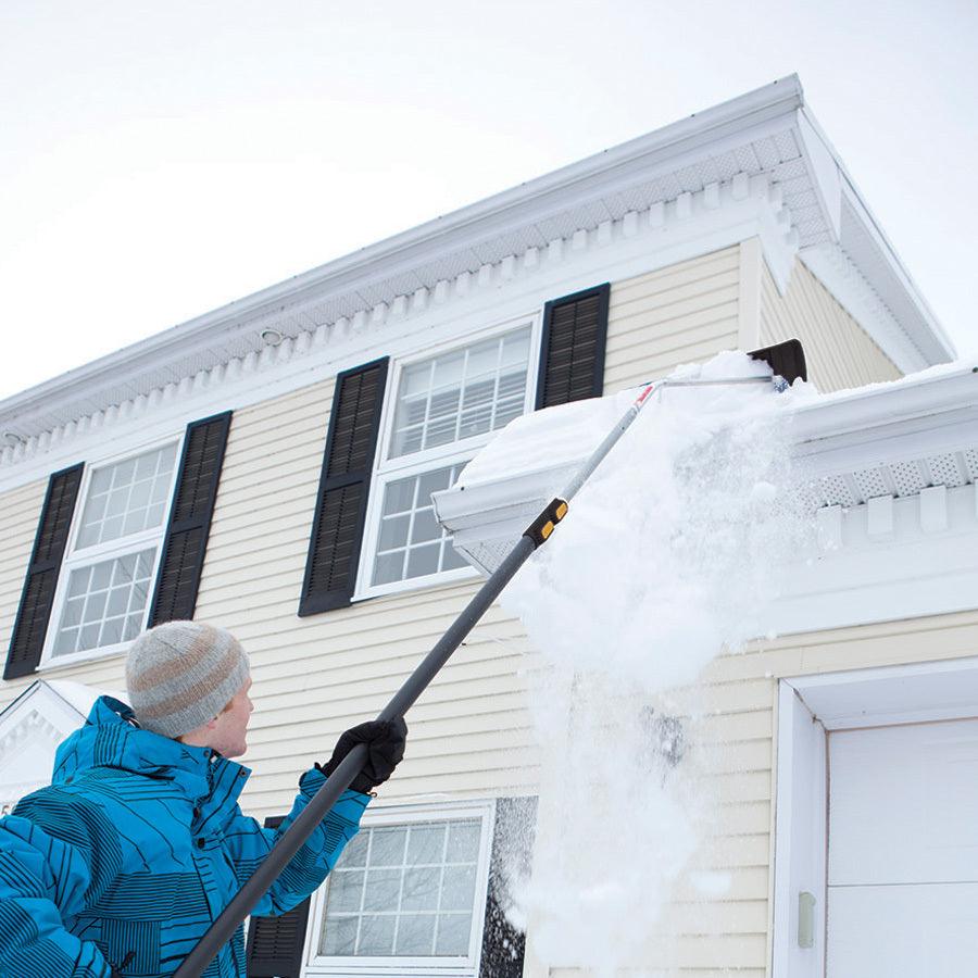 This snow-roof rake can help prevent structural and water damage to your home that can result from heavy snow left on your homes roof Lightweight, yet designed for strength and durability ?aluminum and temperature resistant plastics The handle enables a very long reach and makes it easier and safer to use than climbing up on your roof with a snow shovel End grip for better hand placement It features an aluminum handle that extends to 17-ft and a 24-in poly blade The push-button, telescoping design makes it sleek and collapsible for easy storage Non-slip handle treatment for control The telescoping roof rake is the most innovative roof rake in years