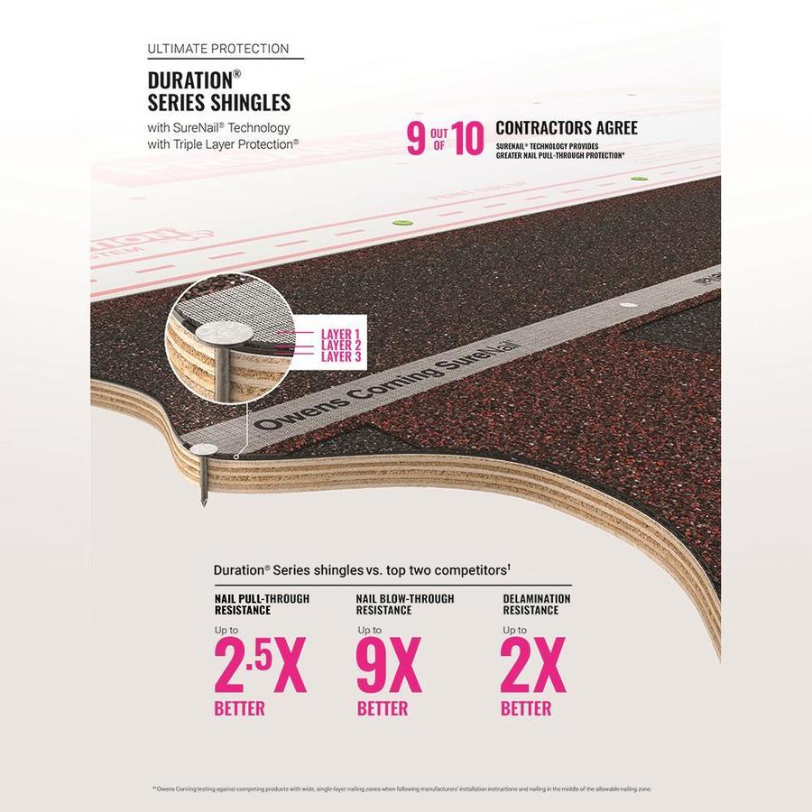 Upgrade your roof with Owens Corning TruDefinition Duration laminated architectural shingles in Onyx Black. Patented SureNail Technology delivers superior fastening strength and 130‑MPH wind performance, while StreakGuard algae protection helps resist black streaks for lasting curb appeal.