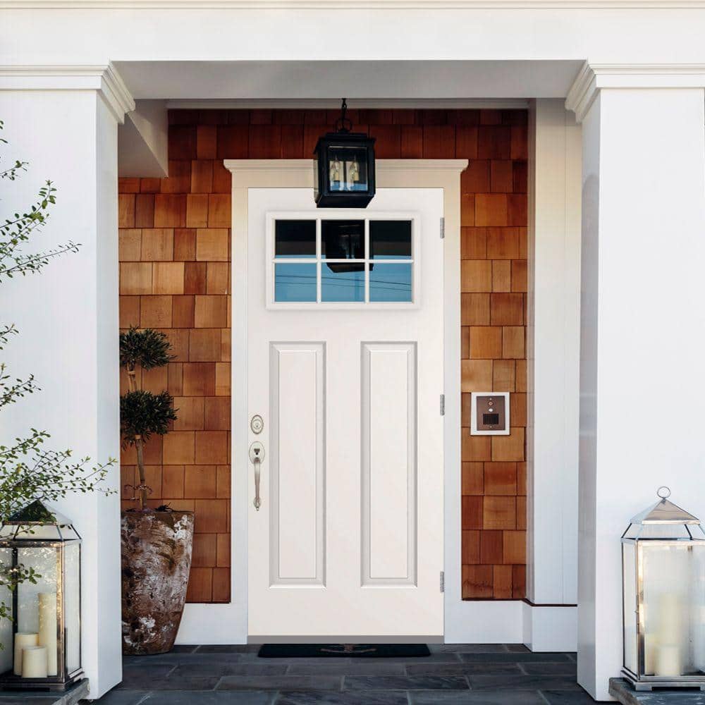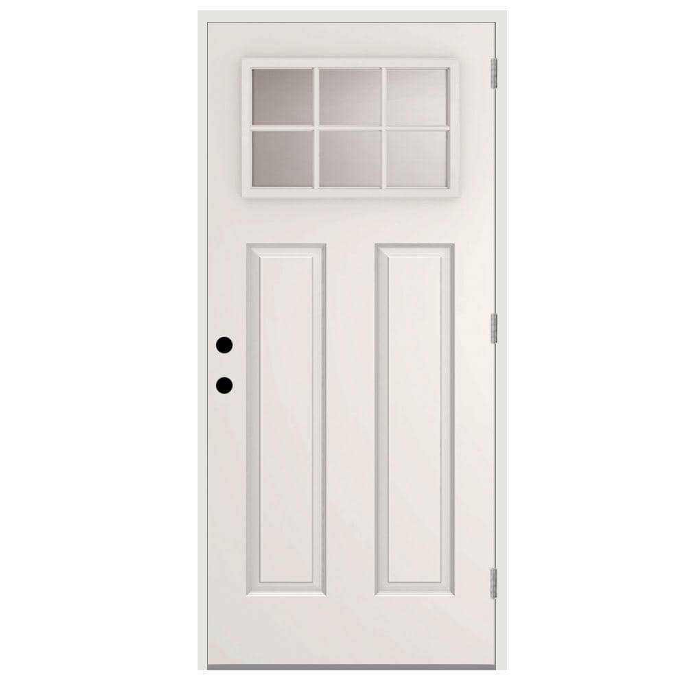 A durable, energy-efficient steel front door prehung in a 4-9/16 in. primed wood frame. The Craftsman-inspired 2-panel design features a 6-lite clear Low-E tempered glass top for style and daylight, with weatherstripping and tamper-proof hinges for security.