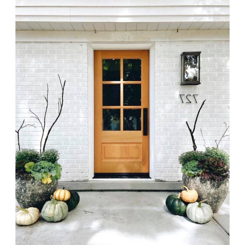 This door instantly elevates the façade with its crisp six-lite glass and sculpted lower panel, creating a balanced interplay of light and shadow. The black-stained Douglas Fir reads luxe and grounded, allowing greenery and brass hardware to glow against it. Pair with a long matte handle set and a warm lantern sconce to complete the narrative. It’s a chic essential that telegraphs craftsmanship and modern heritage at your threshold.