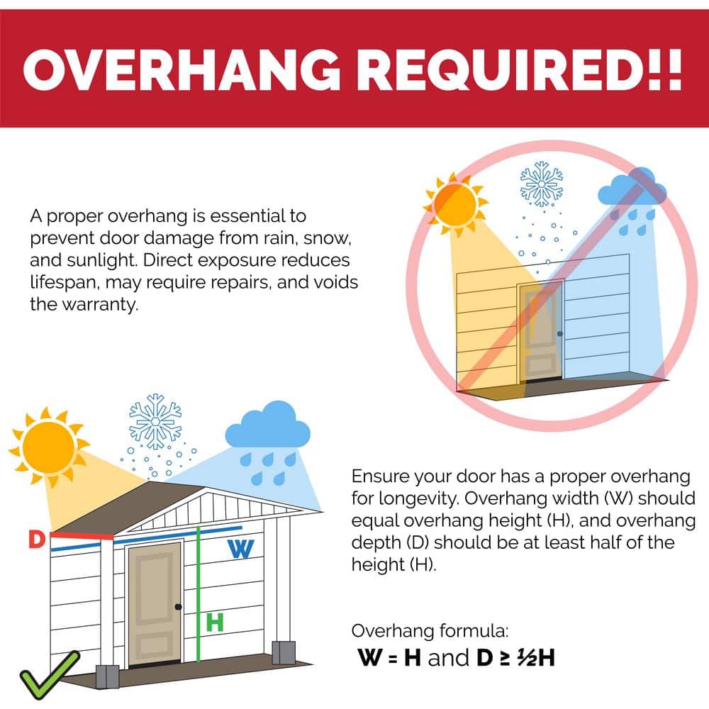 A: A proper overhang is required to maintain warranty and protect the wood; overhang width should equal height and depth at least half the height.