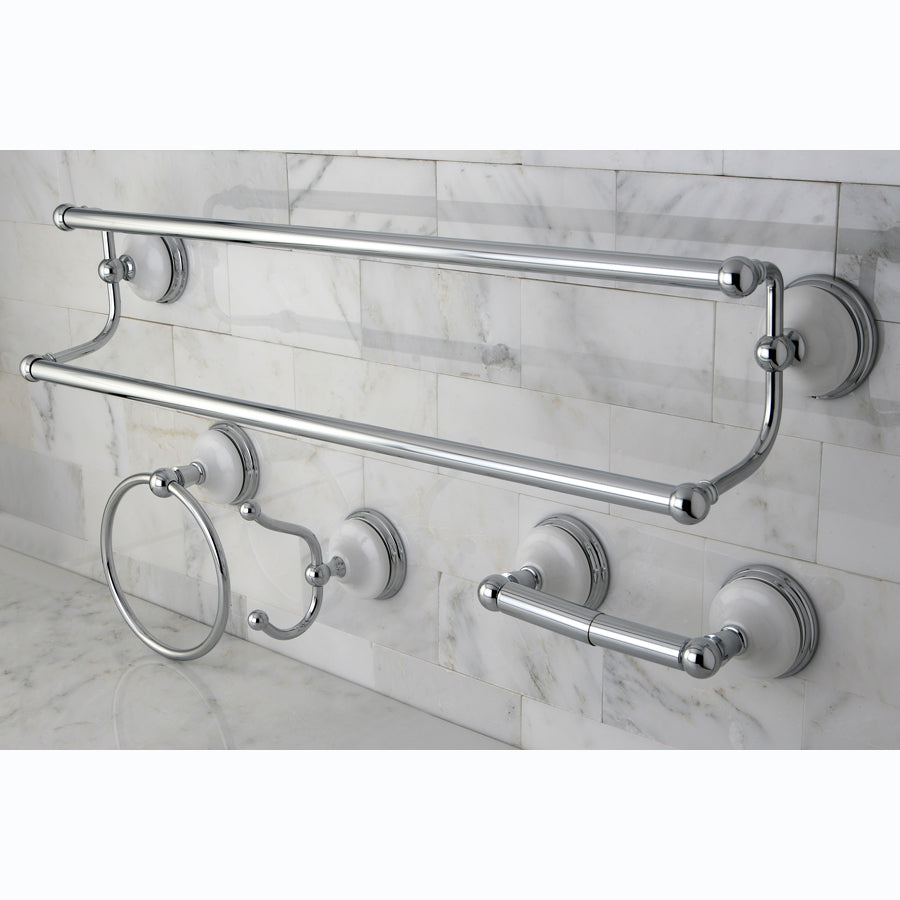 Set includes: 24 in. double towel bar, towel ring, robe hook and toilet paper holder
