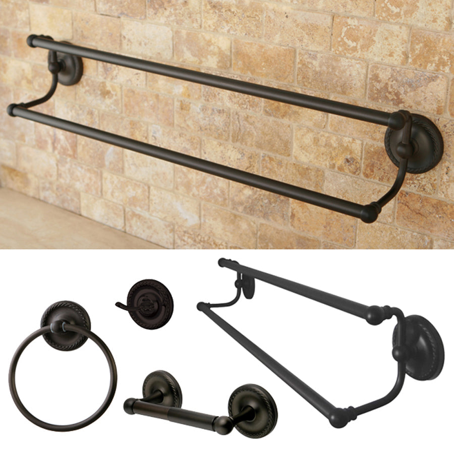 The Laurel Collection features rope-lined escutcheons and intricate textures for a graceful and cherubic bathroom Constructed of solid forged brass for durability and a rich finish Set includes: 24 in. double towel bar, towel ring, robe hook and toilet paper holder Concealed screws secure wall-mounted fixtures
