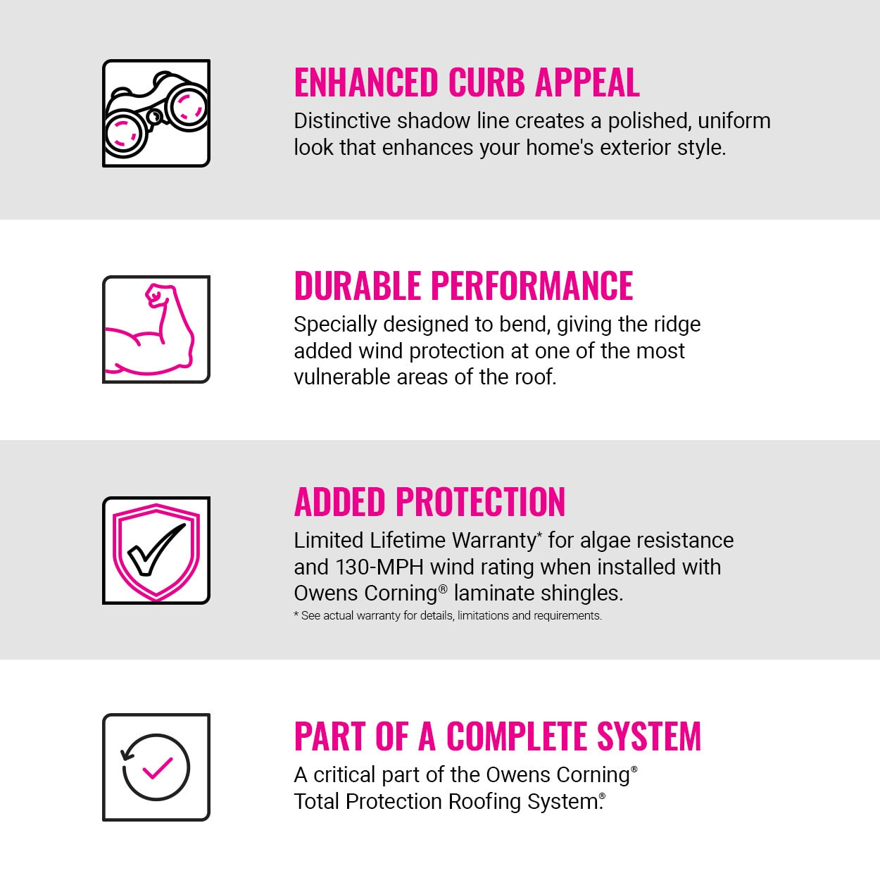 Q: What is the wind rating? A: Up to 130 MPH when installed with Owens Corning laminate shingles; product spec lists 110 MPH rating—follow manufacturer instructions.