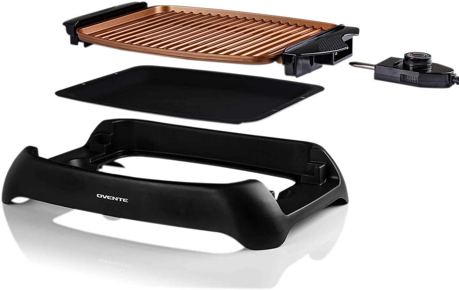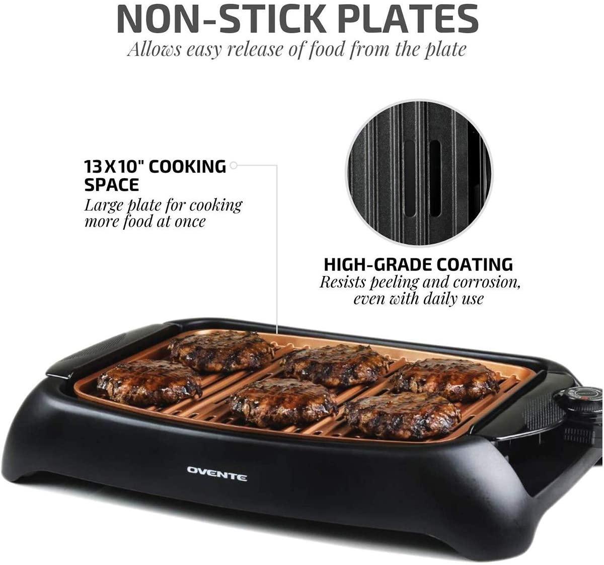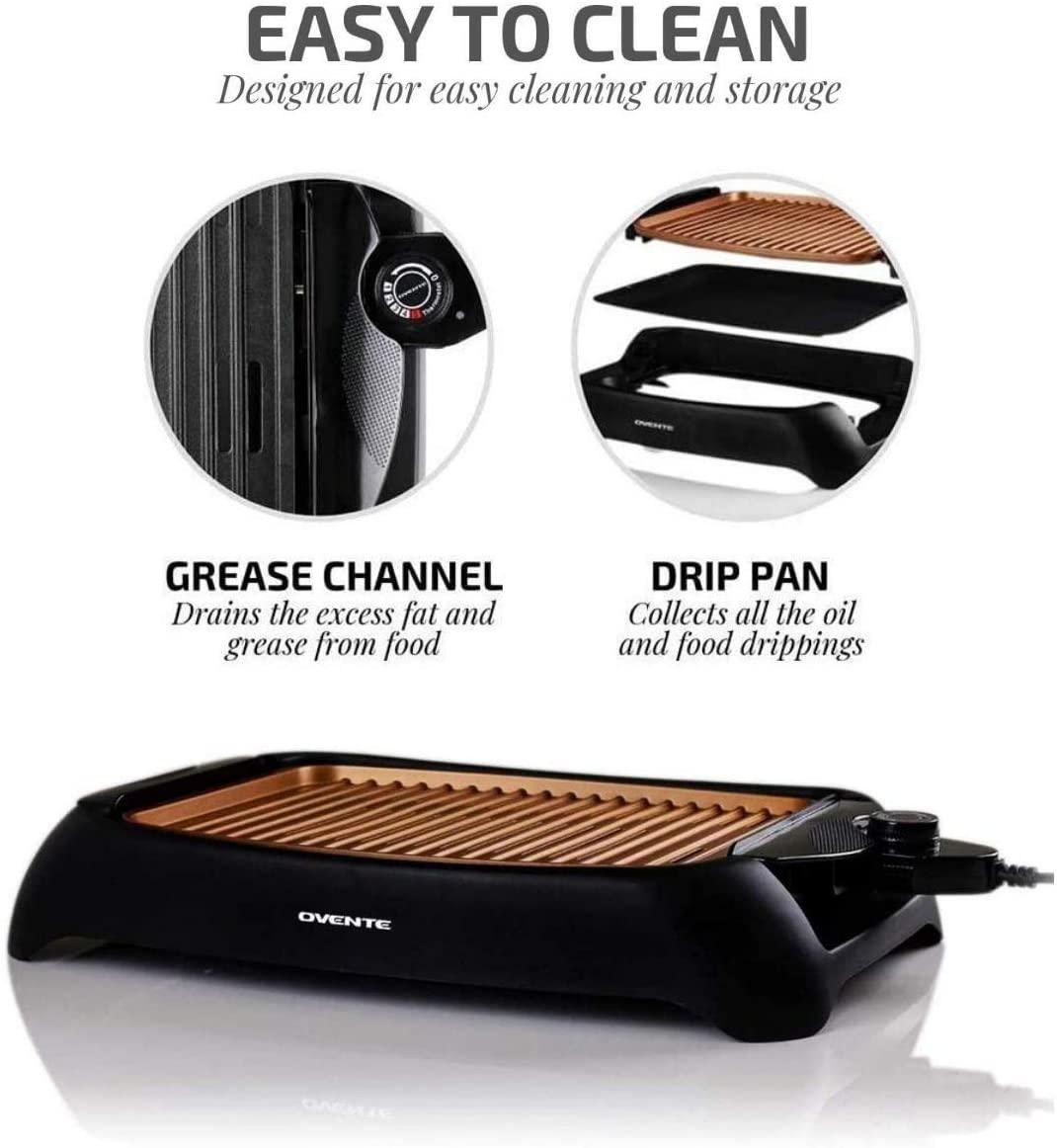 Ovente Electric Cooking Grill 13 x 10 Inch Nonstick Cast Iron Flat Plate with Oil Drip Pan & Temperature Control, Indoor Kitchen or Outdoor Easy Clean Compact for BBQ Grilling Meat, Copper GD1632NLCO