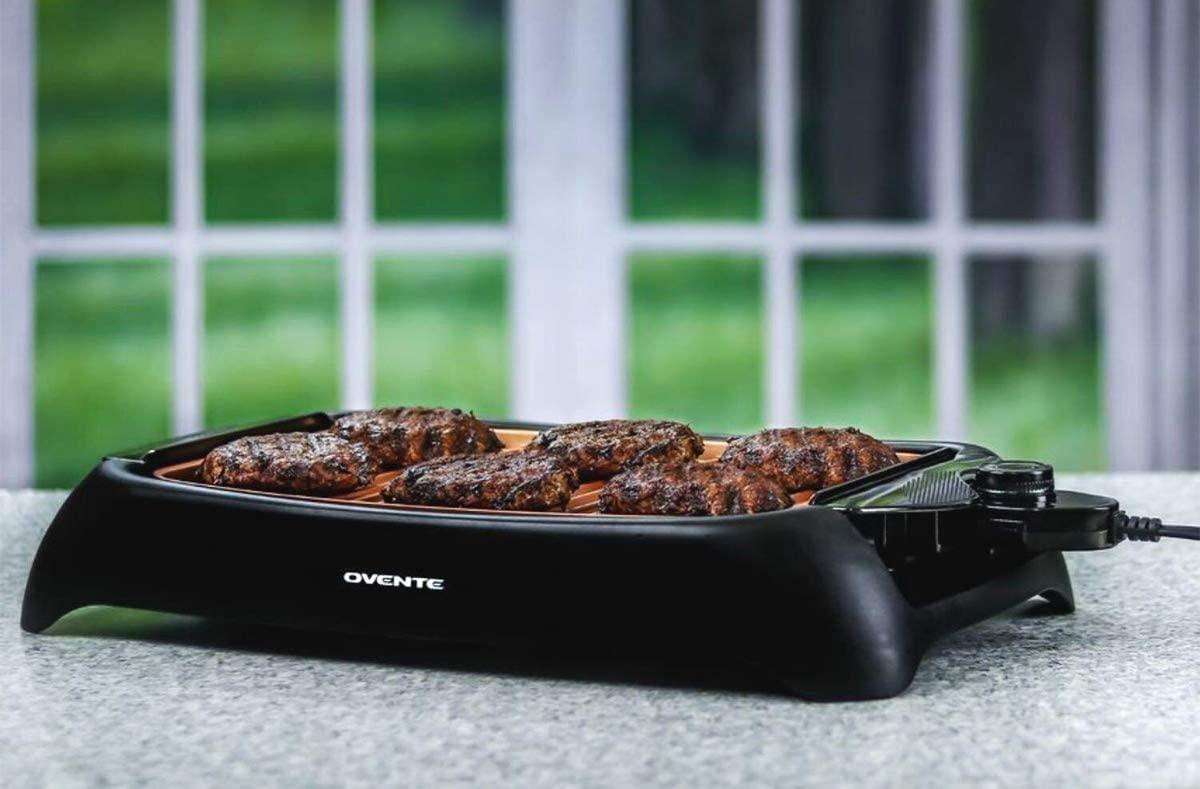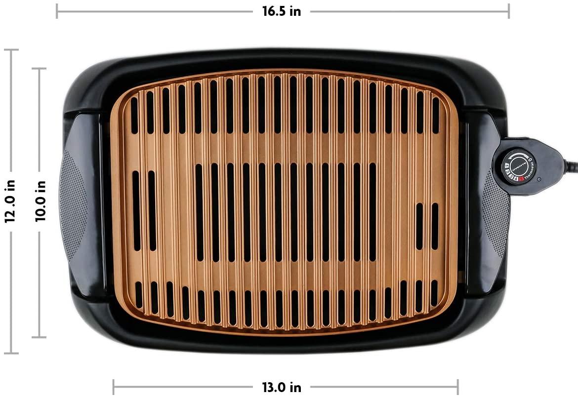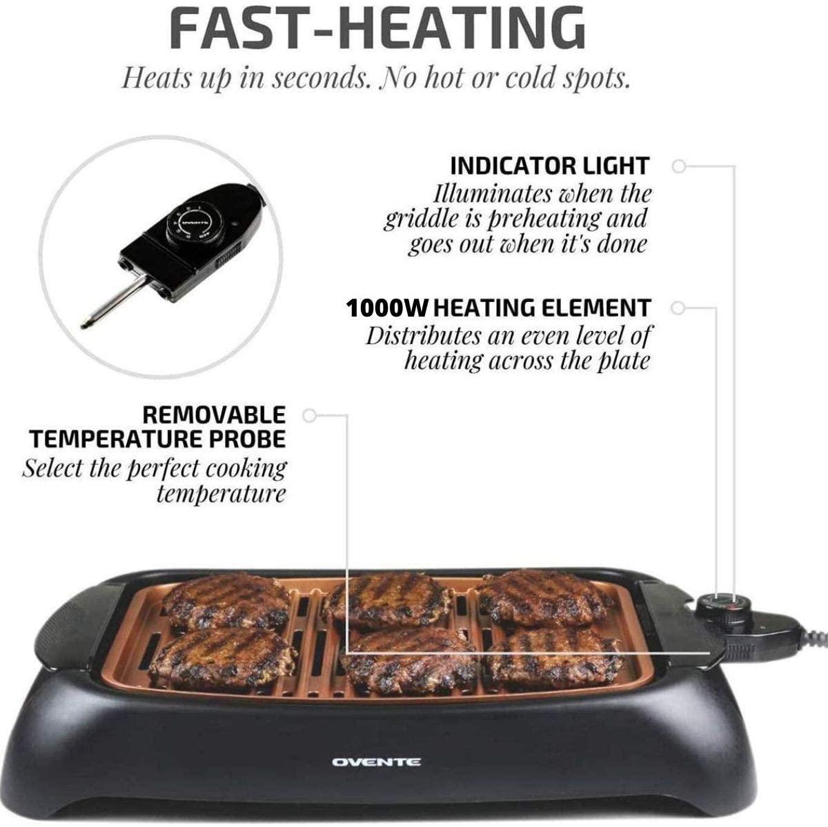 Ovente Electric Cooking Grill 13 x 10 Inch Nonstick Cast Iron Flat Plate with Oil Drip Pan & Temperature Control, Indoor Kitchen or Outdoor Easy Clean Compact for BBQ Grilling Meat, Copper GD1632NLCO