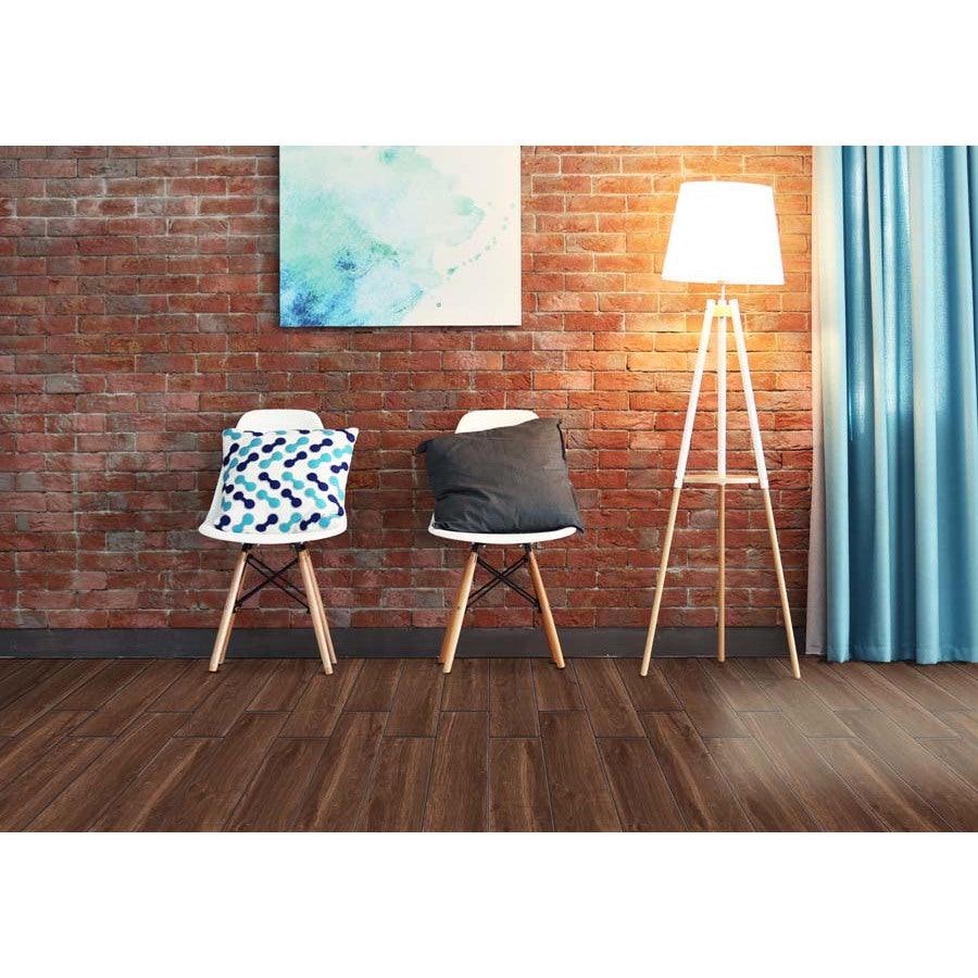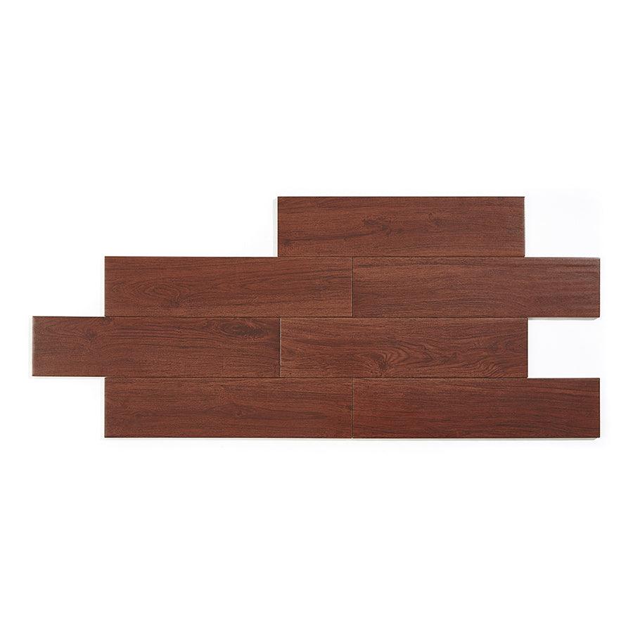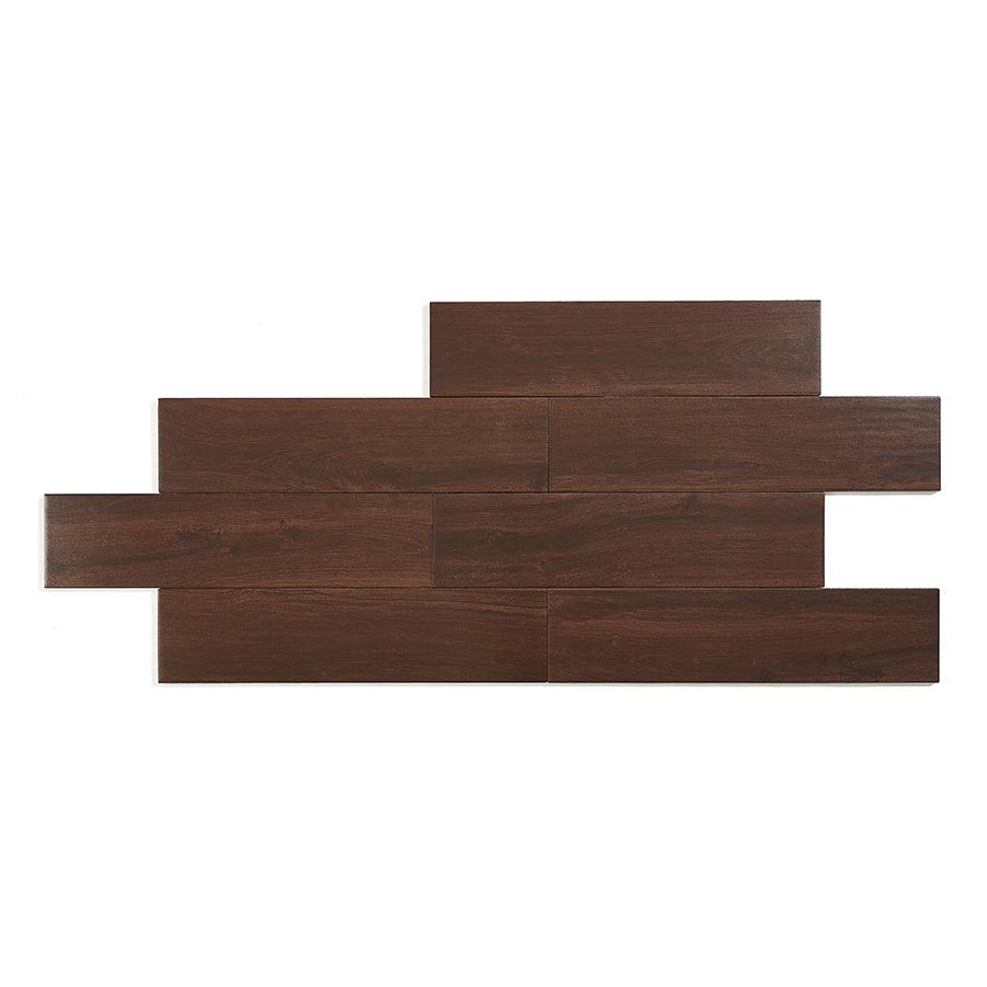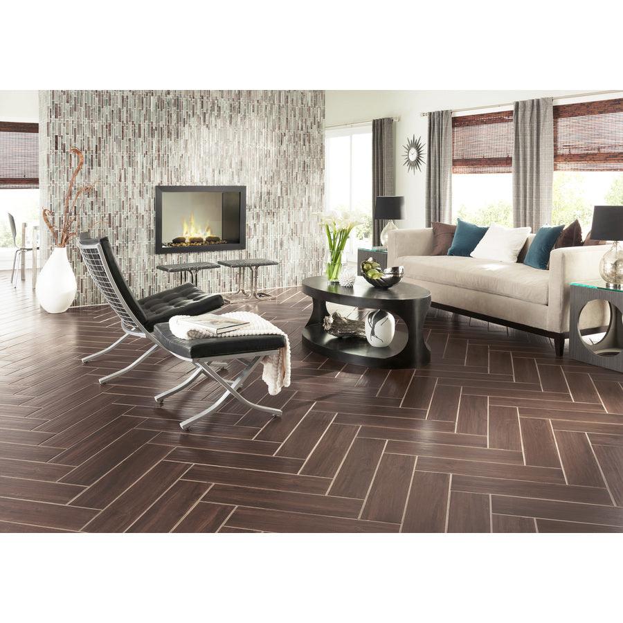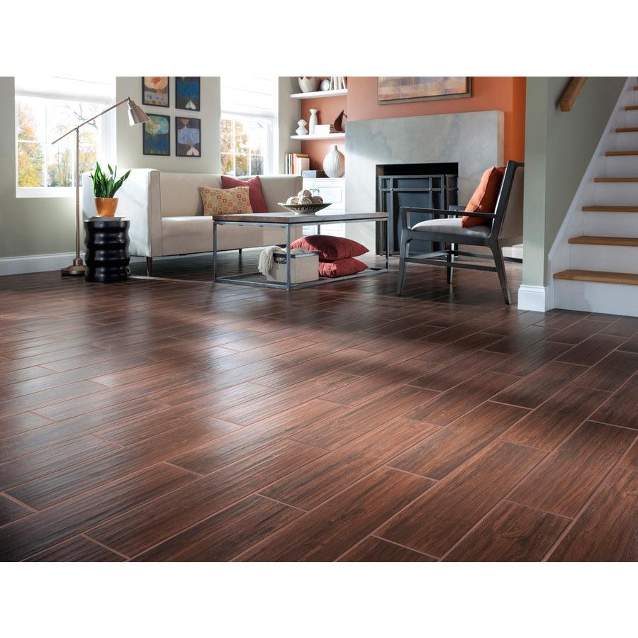 Wood look porcelain tile, made in the USA with natural ingredients, eco friendly Recommended to install at a 1/3 offset or herringbone pattern with a minimum grout of 3/16 Low maintenance, easy to clean, no VOCs, pet proof, this tile is slip resistant and meets the standards with a DCOF of 0.42 Impervious to water (fully submersible), frost proof tile can be installed indoors or out 11.40 square feet per case, 12 pieces per case, weight is 52.8 lb. per case Recommended grout color is Mapei Cocoa #79 6 in. width x 24 in. length x 0.39 in. thick Glazed tile with a matte finish and moderate shade variation to create a unique design, durable and easy to clean for hassle-free upkeep P.E.I. rating IV is suitable for commercial and residential applications including kitchens, halls, corridors, balconies, terraces and almost anywhere