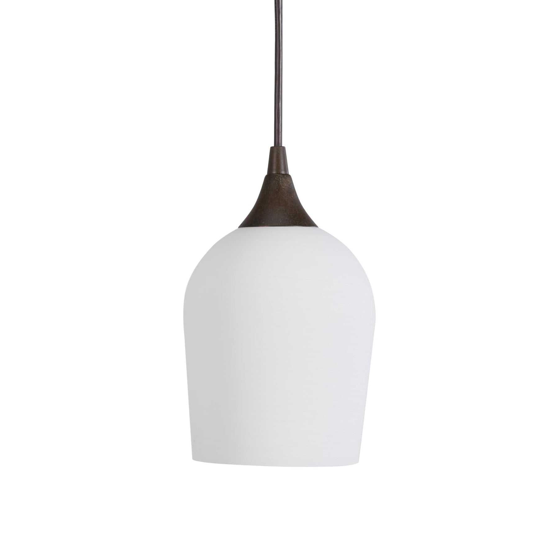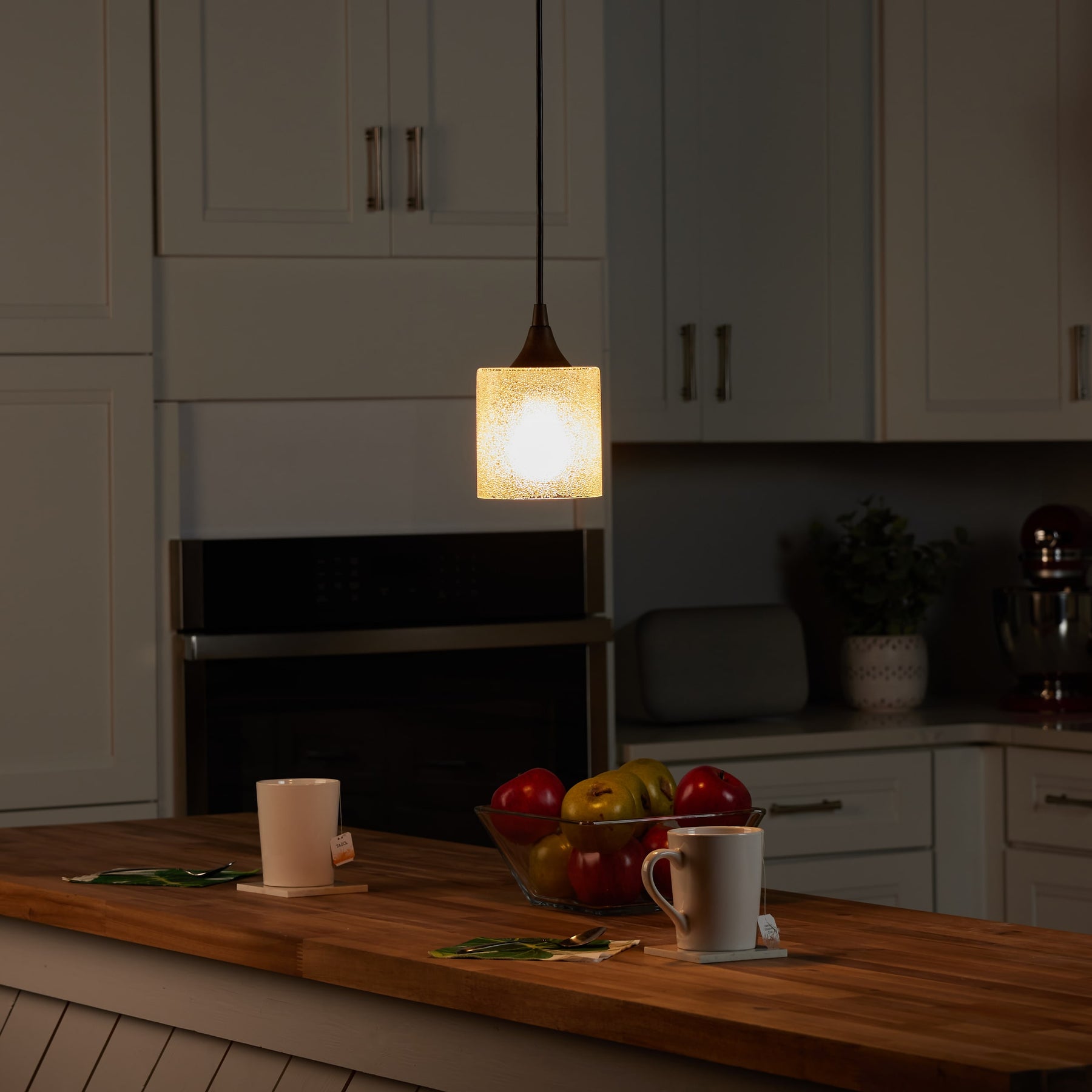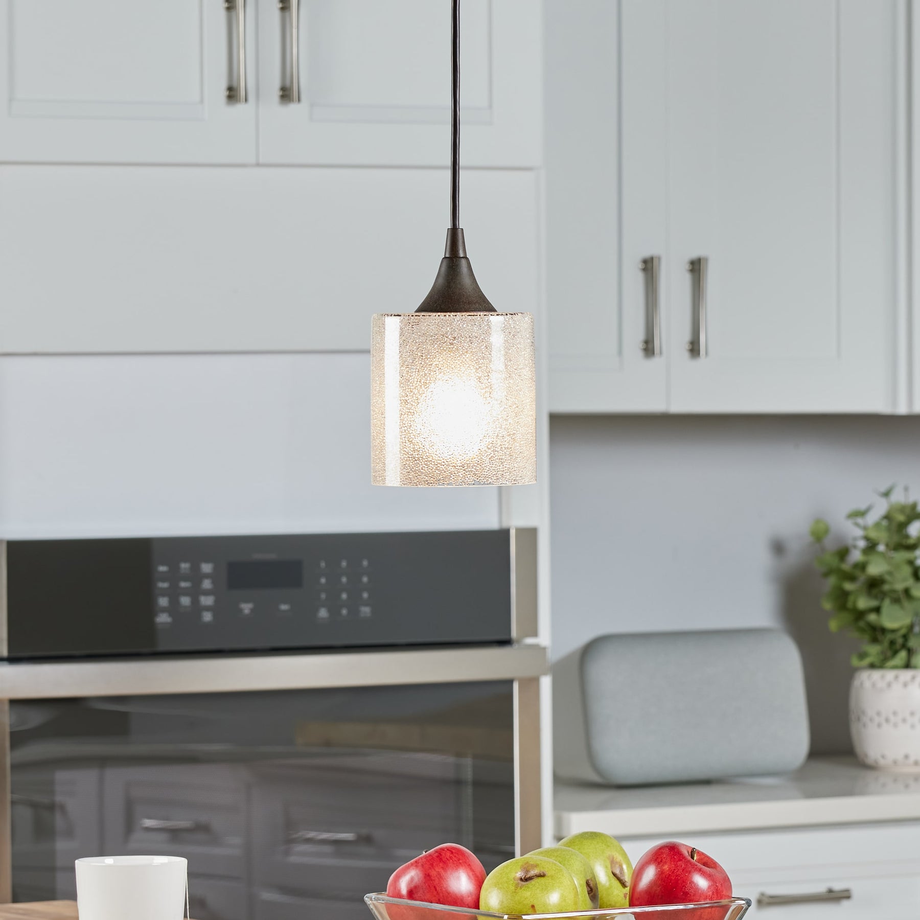 This transitional bronze mini pendant fixture lets you mix and match with a variety of compatible glass shades to create a custom look. Damp-rated and hardwired with an adjustable cord up to 63 inches, it uses one medium-base bulb up to 60W for versatile task or ambient lighting.