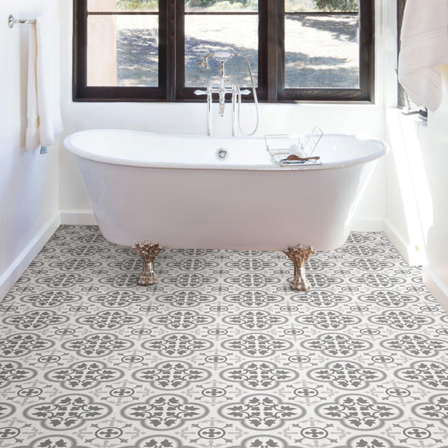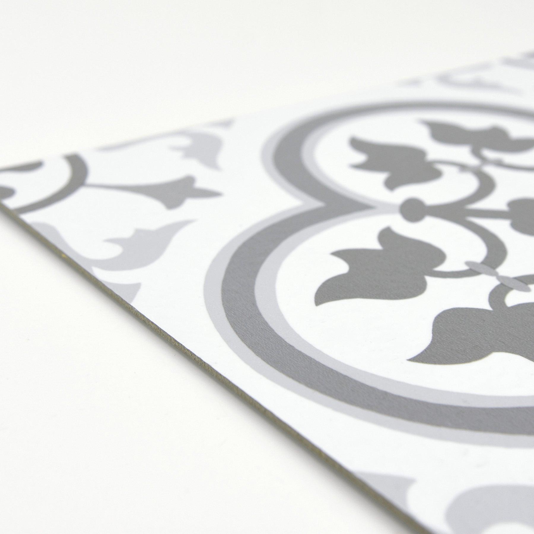 Brighten up kitchen and bathroom floors with these peel and stick virgin vinyl tiles. A grey gothic-style motif effortlessly complements a crisp white background. FloorPops Remy Peel & Stick Floor Tiles contain 10 square pieces on 10 sheets that measure 12 x 12 inches. This product measures 60 inches long, 24 inches wide, and 0.06 inches thick when assembled and weighs 5.5 pounds. FloorPops have a textured low lustre finish and one pack covers 10 square feet.