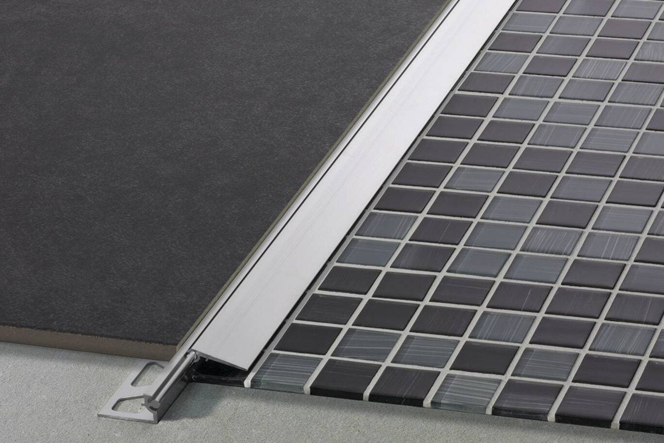 Protect tile edges and create safe, sloped transitions with Schluter RENO-V. This satin anodized aluminum profile features a moveable, adjustable transition arm to meet lower adjacent floor heights and includes an integrated joint spacer for clean, consistent grout joints.
