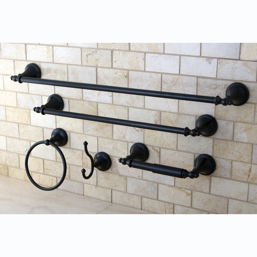 Set includes: 24 in. towel bar, 18 in. towel bar, towel ring, robe hook and toilet paper holder