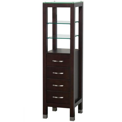 Modern freestanding linen tower crafted from environmentally friendly oak with a rich espresso finish. Features four smooth-glide drawers and open glass shelving to keep bathroom essentials organized and within reach.