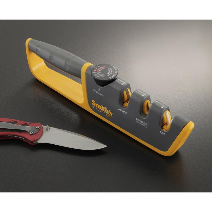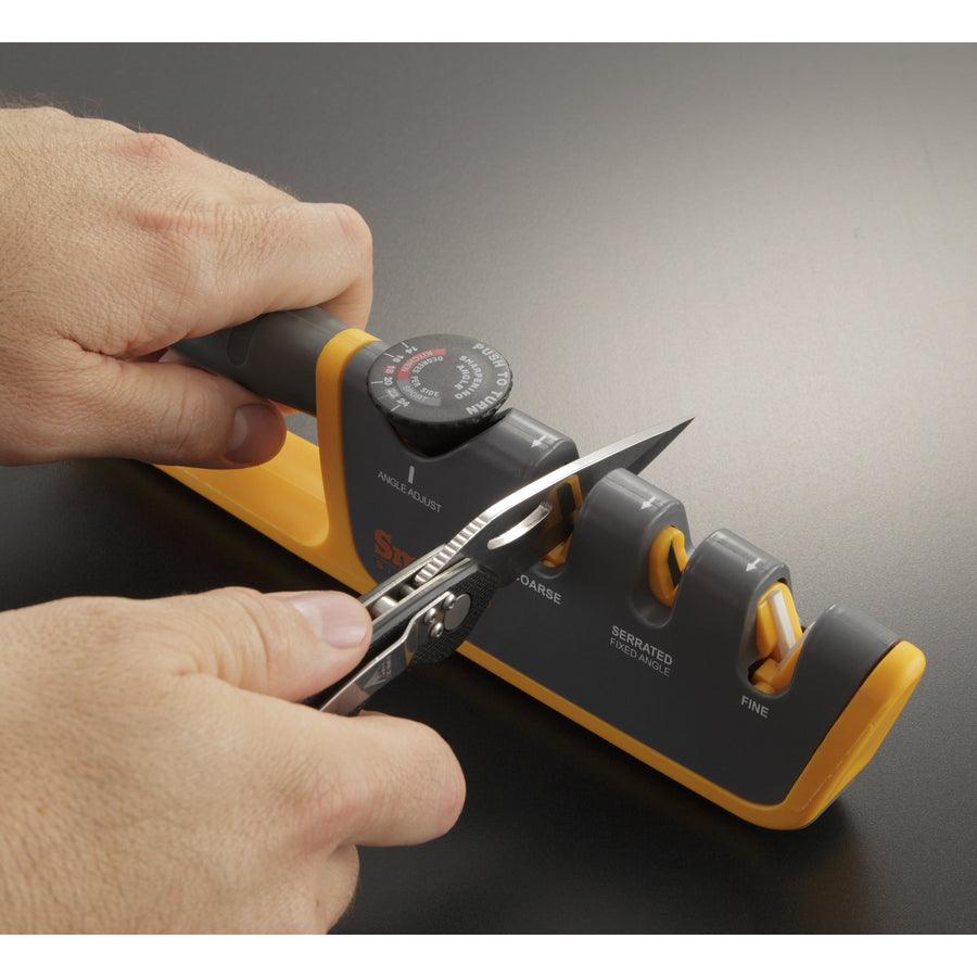 Exclusive angle-adjust knob allows user to adjust the sharpening to original factory grind or to a preferred angle