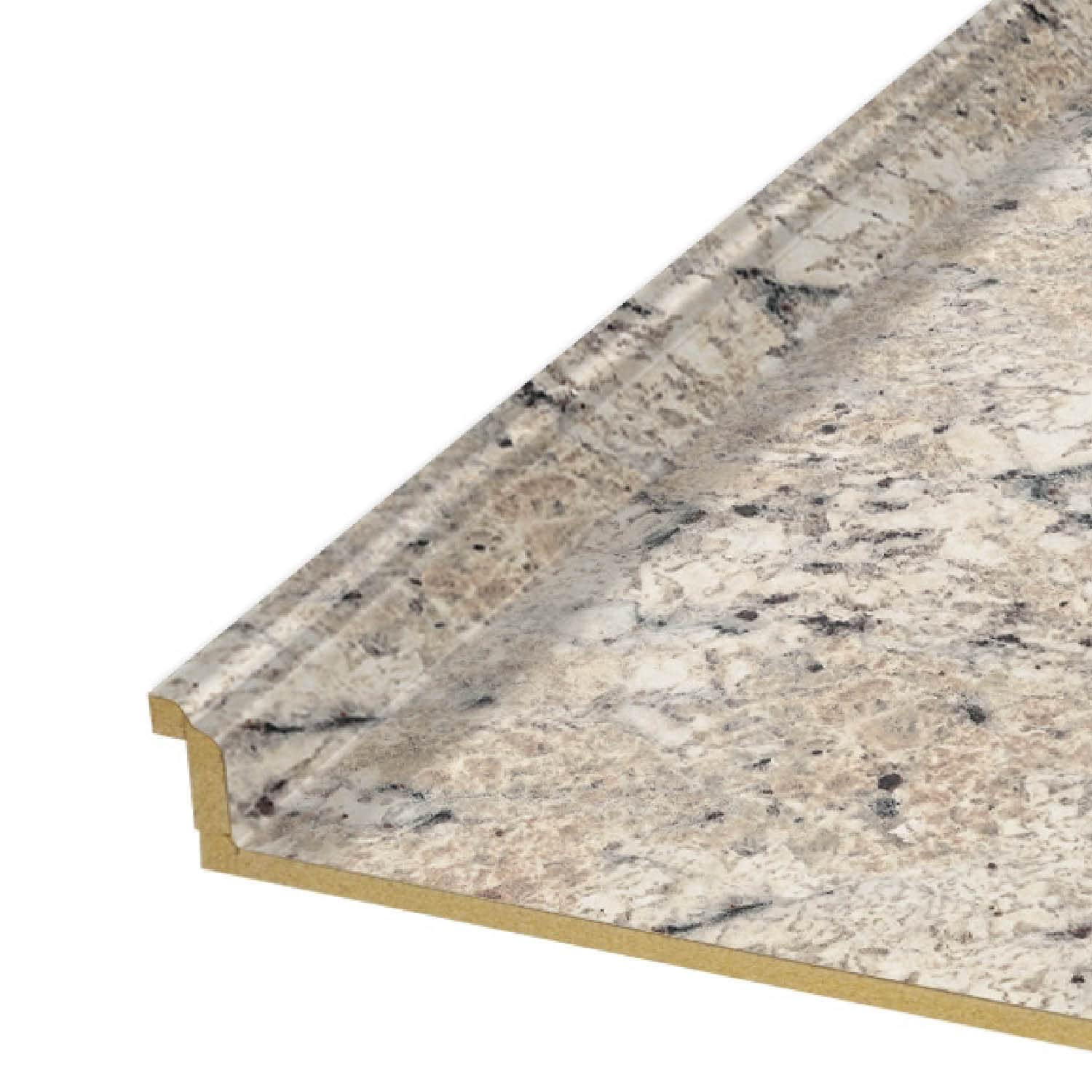 A durable, granite-look laminate countertop featuring Formica’s Etchings finish and an integrated backsplash. The Barcelona double-waterfall edge and right-hand miter cut create a seamless corner installation for kitchens, baths, and laundry rooms.