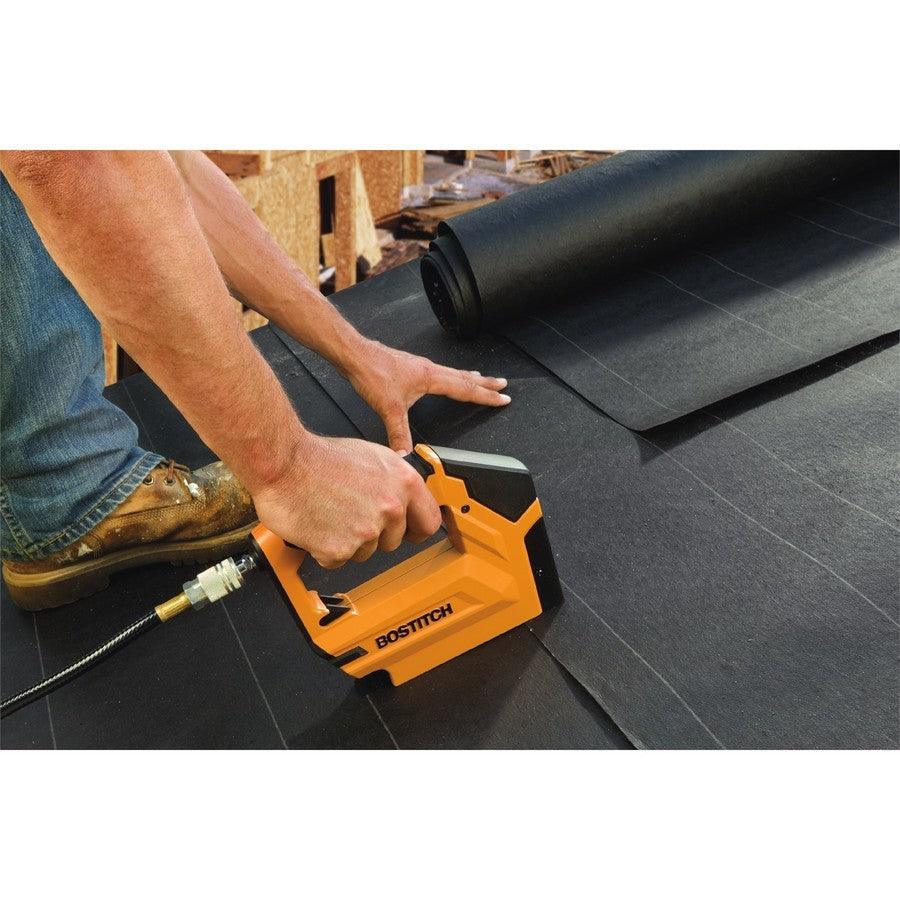 Combination of pneumatic tacker and brad nailer uses both T50 staples and brad nails for wide range of applications