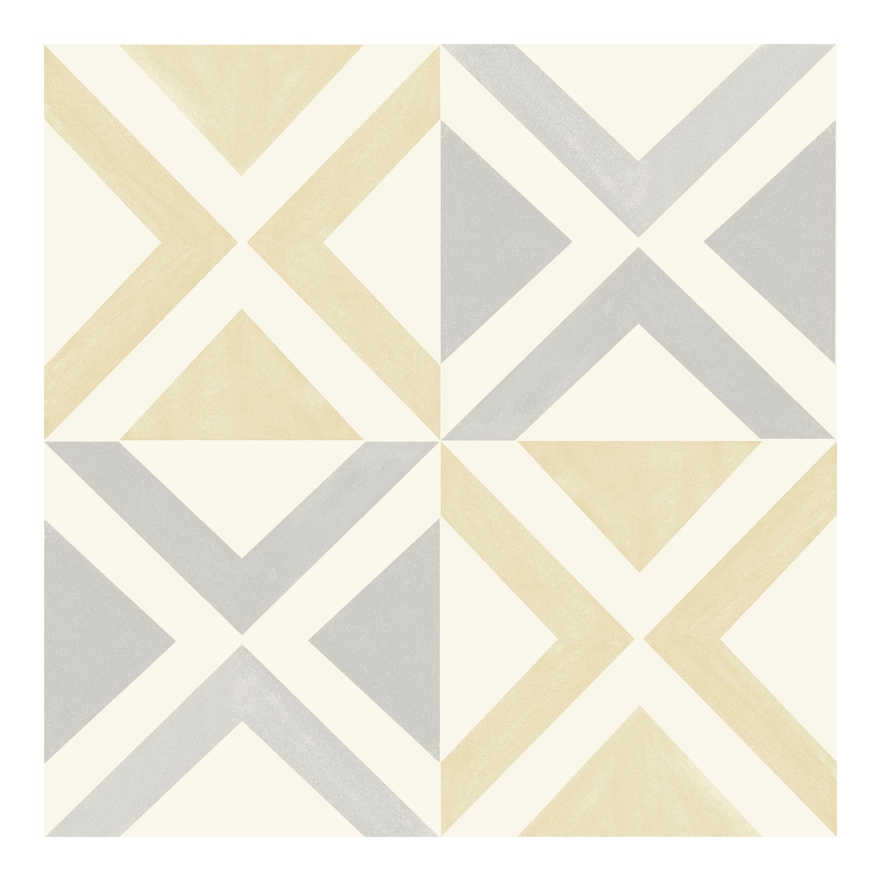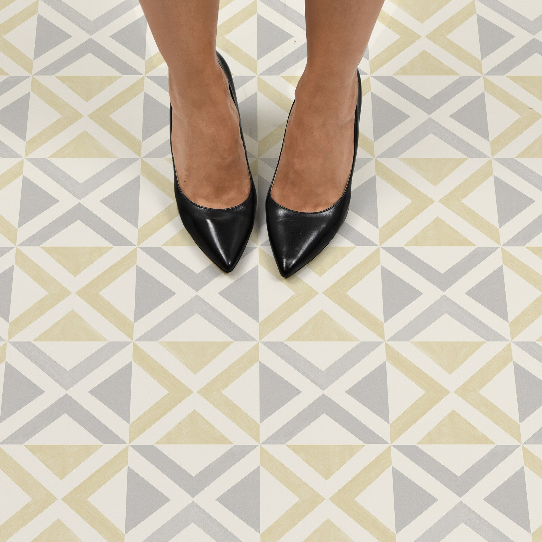 Soft grey and sun-washed yellow form a chic geometric rhythm that instantly enlivens a room. The low-lustre vinyl finish adds a refined touch while feeling effortless and approachable. Try these tiles in a powder room or breakfast nook to layer pattern under crisp cabinetry and warm wood. It’s an easy, luxurious foundation that transforms everyday spaces with style.