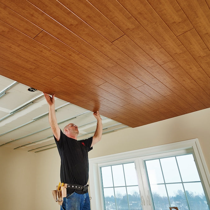 Q: Does this system work on uneven ceilings? A: Yes, it can be installed on uneven or popcorn ceilings, ensuring a smooth tile or plank finish.
