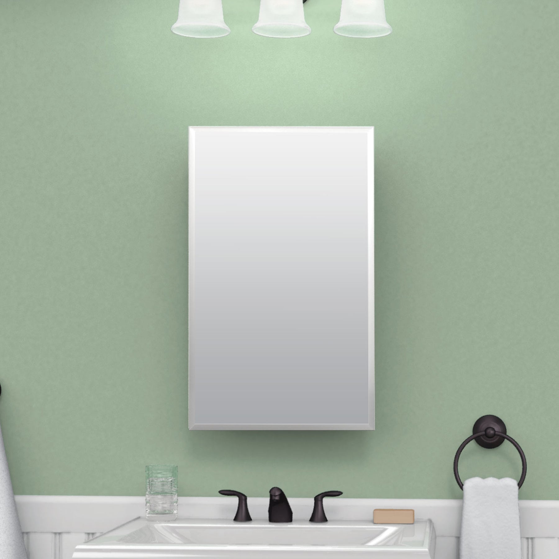 A versatile, frameless mirrored medicine cabinet with a rustproof injection-molded plastic body. Dual mounting lets you install it surface-mounted or recessed, and the reversible door with beveled edges adds clean style to any bath.